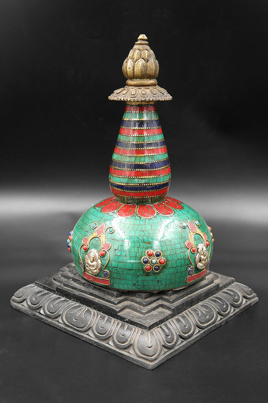 Buddhist Handmade Stupa with Gemstones and wooden base