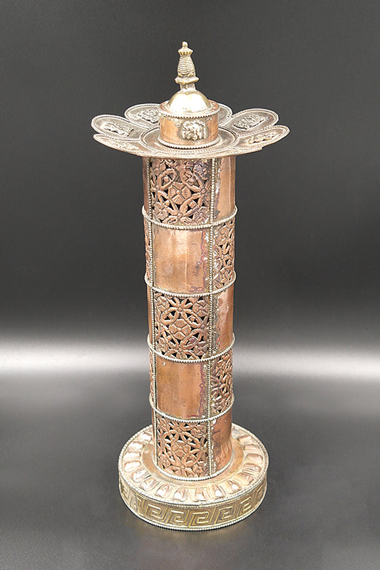 Cylindrical Shape Copper incense burner with stupa on top 13.5"