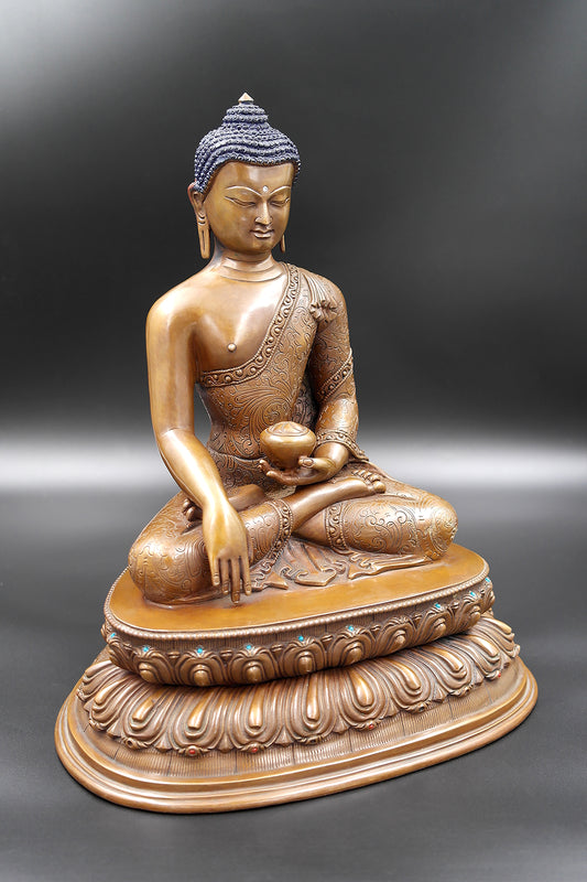 Antiqued Copper Shakyamuni Buddha Statue in double Lotus, 11"