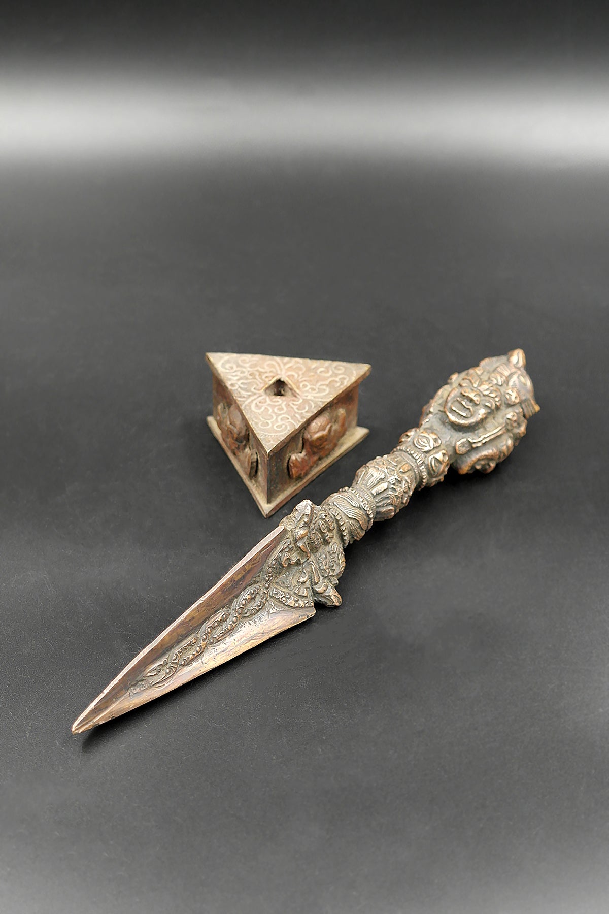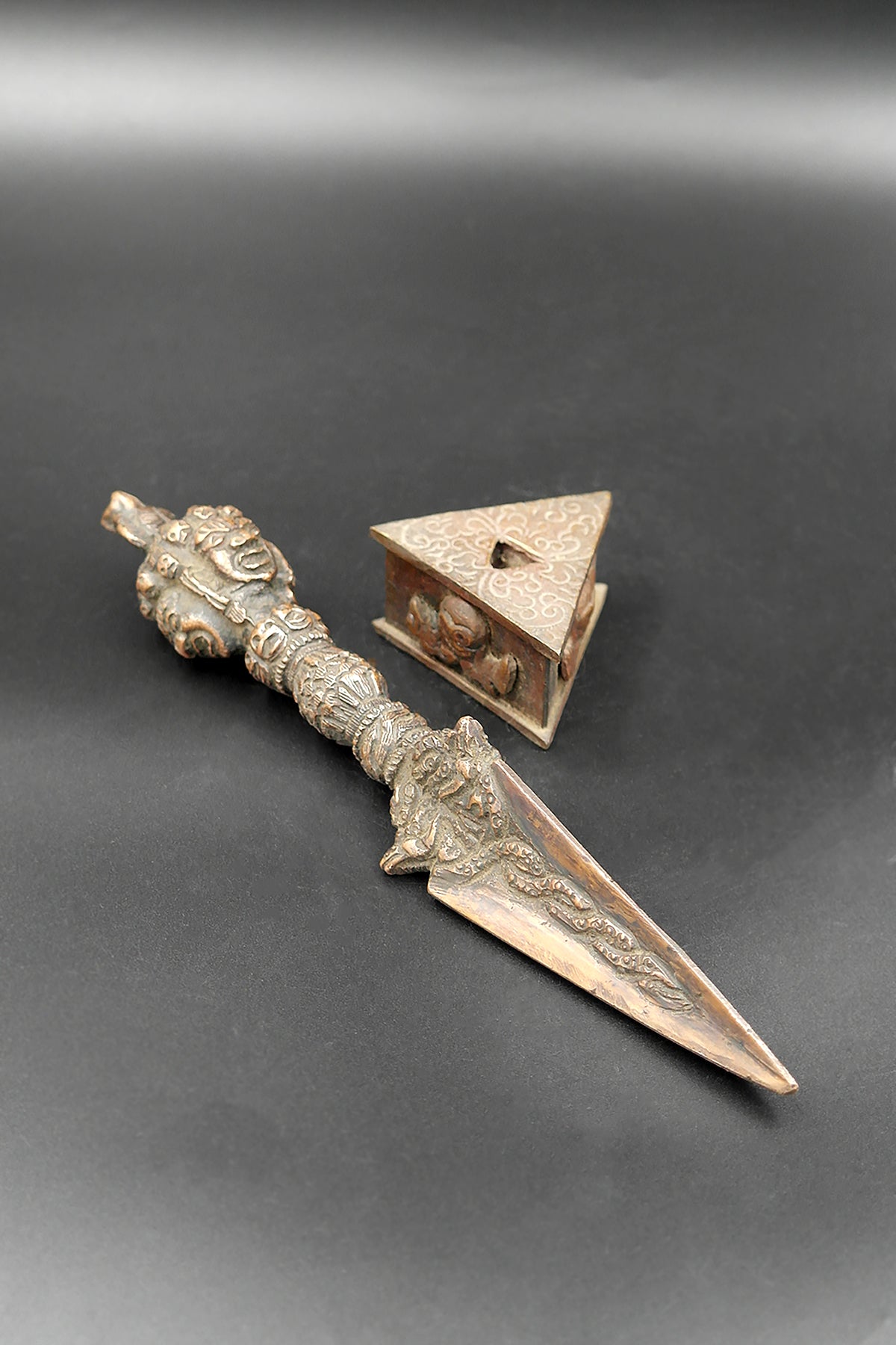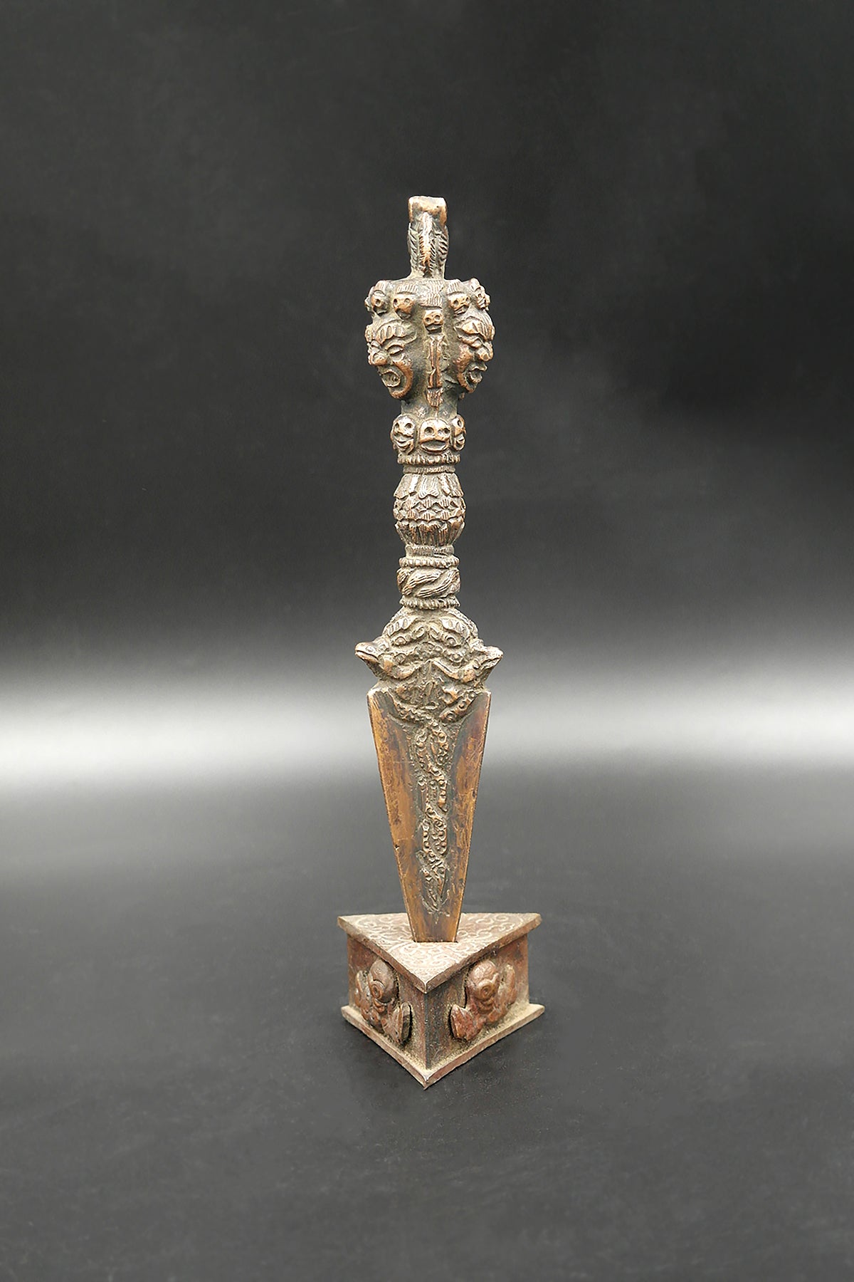 Antiquated Copper Triple faced Phurba is also closely related to the Tibetan Buddhist god Vajrakilaya. This god uses Phurba to eliminate bad emotions like violence, hatred, and anger! He binds bad energy to the Phurba blade and purifies it with the tip. The head of Phurba is also used for blessings. So, Phurba should not be considered a fighting weapon, but a sacred tool for the mind and soul.