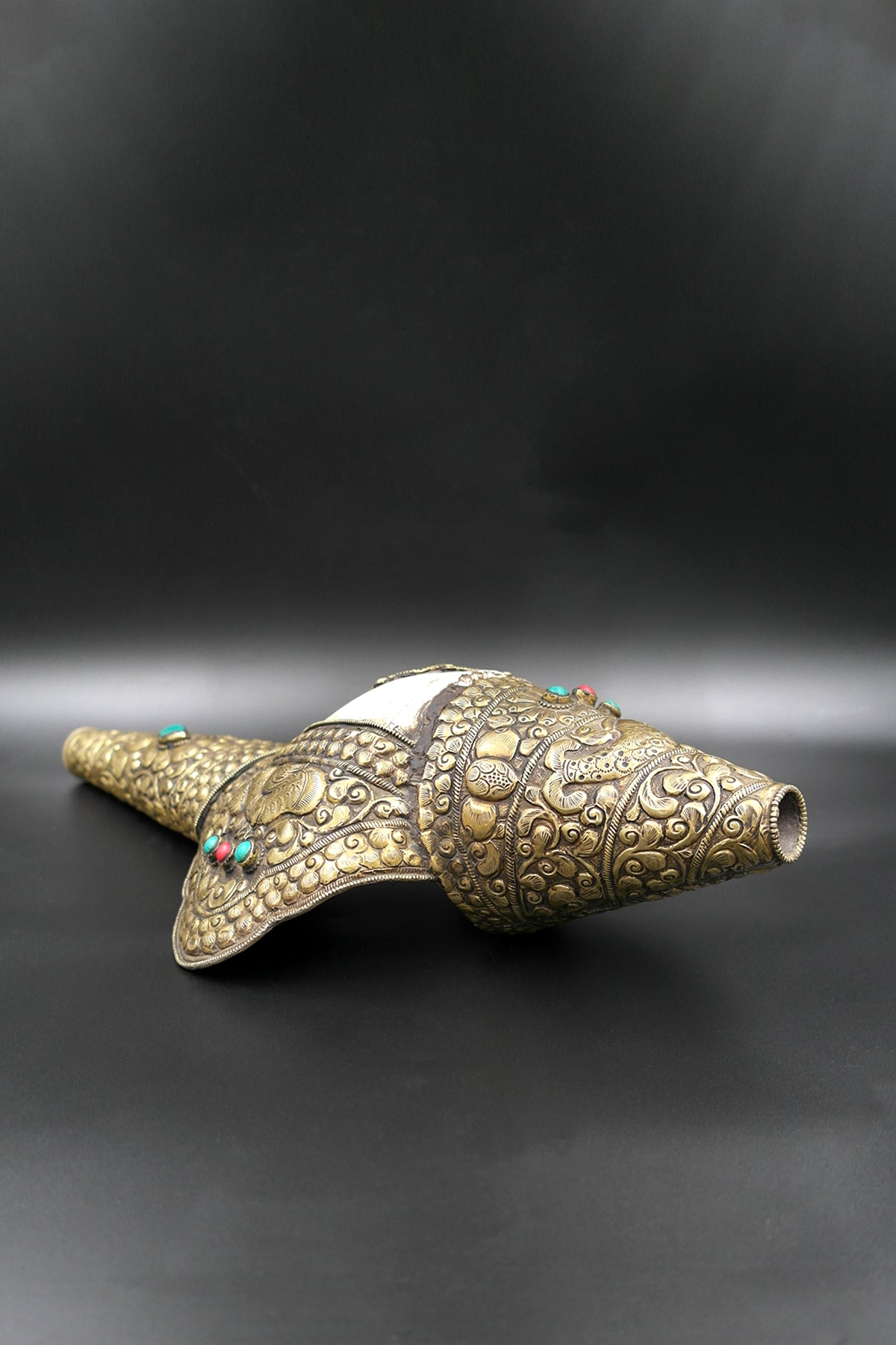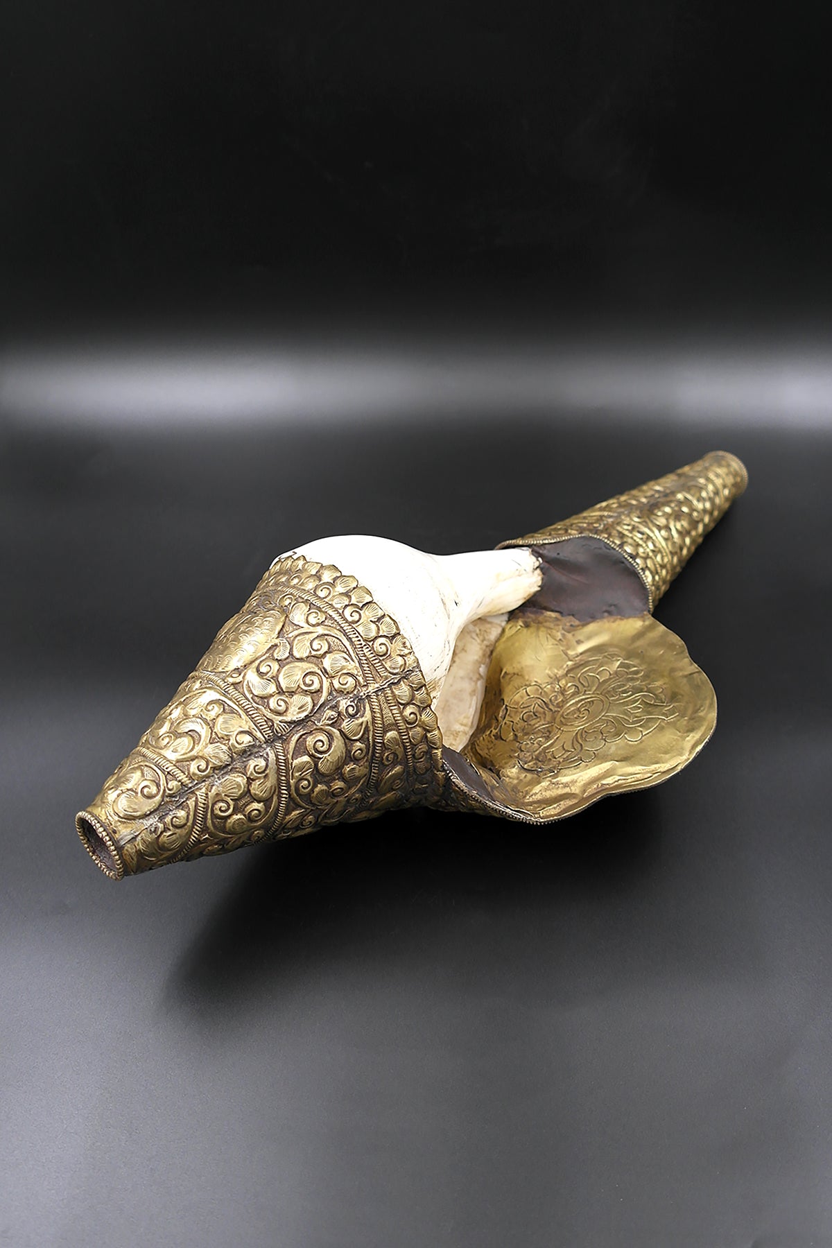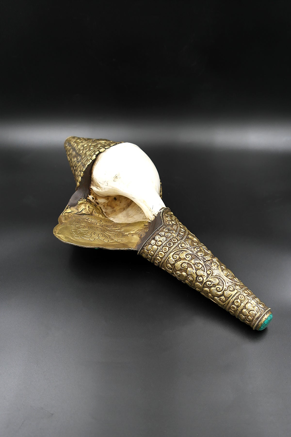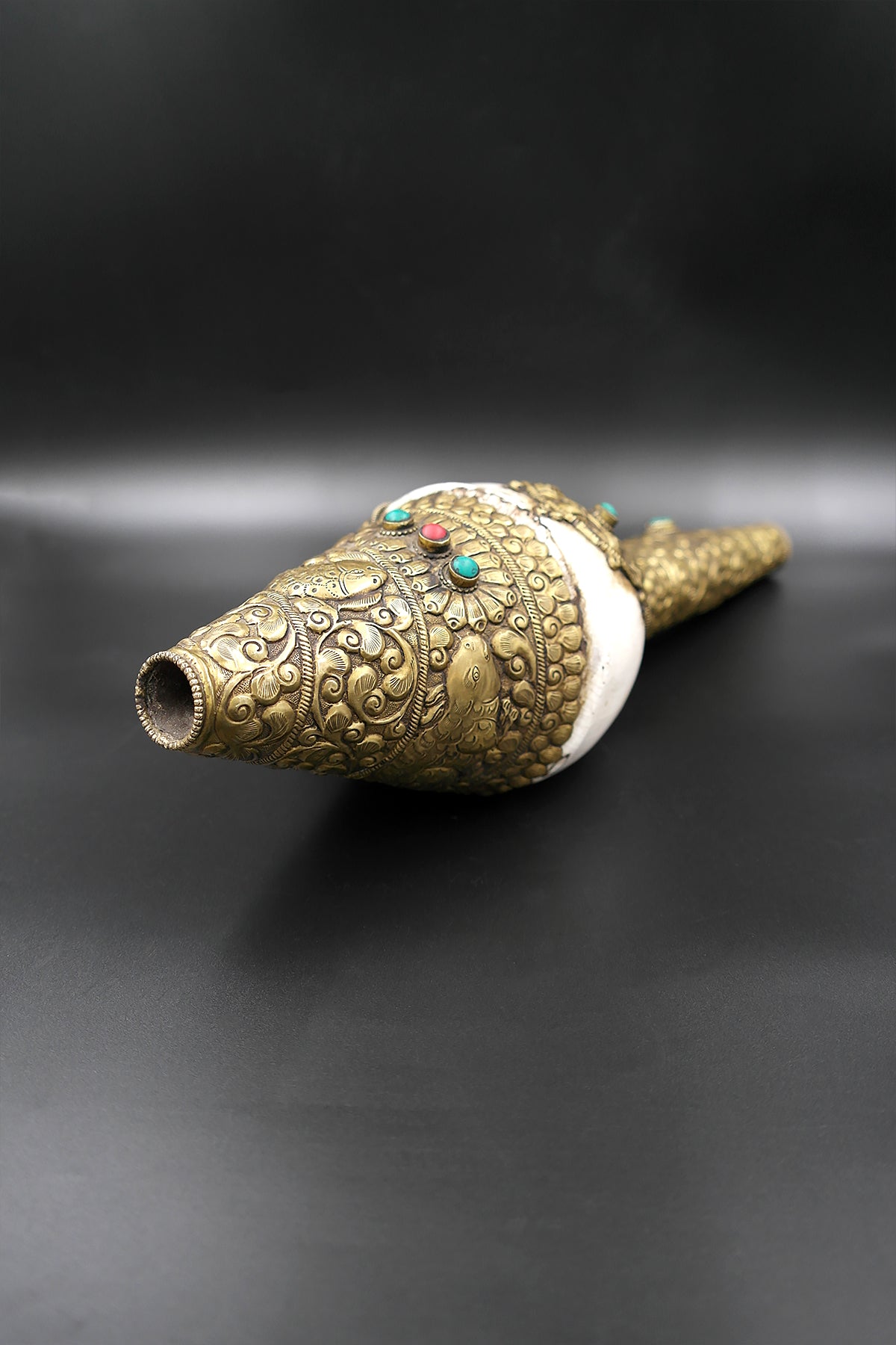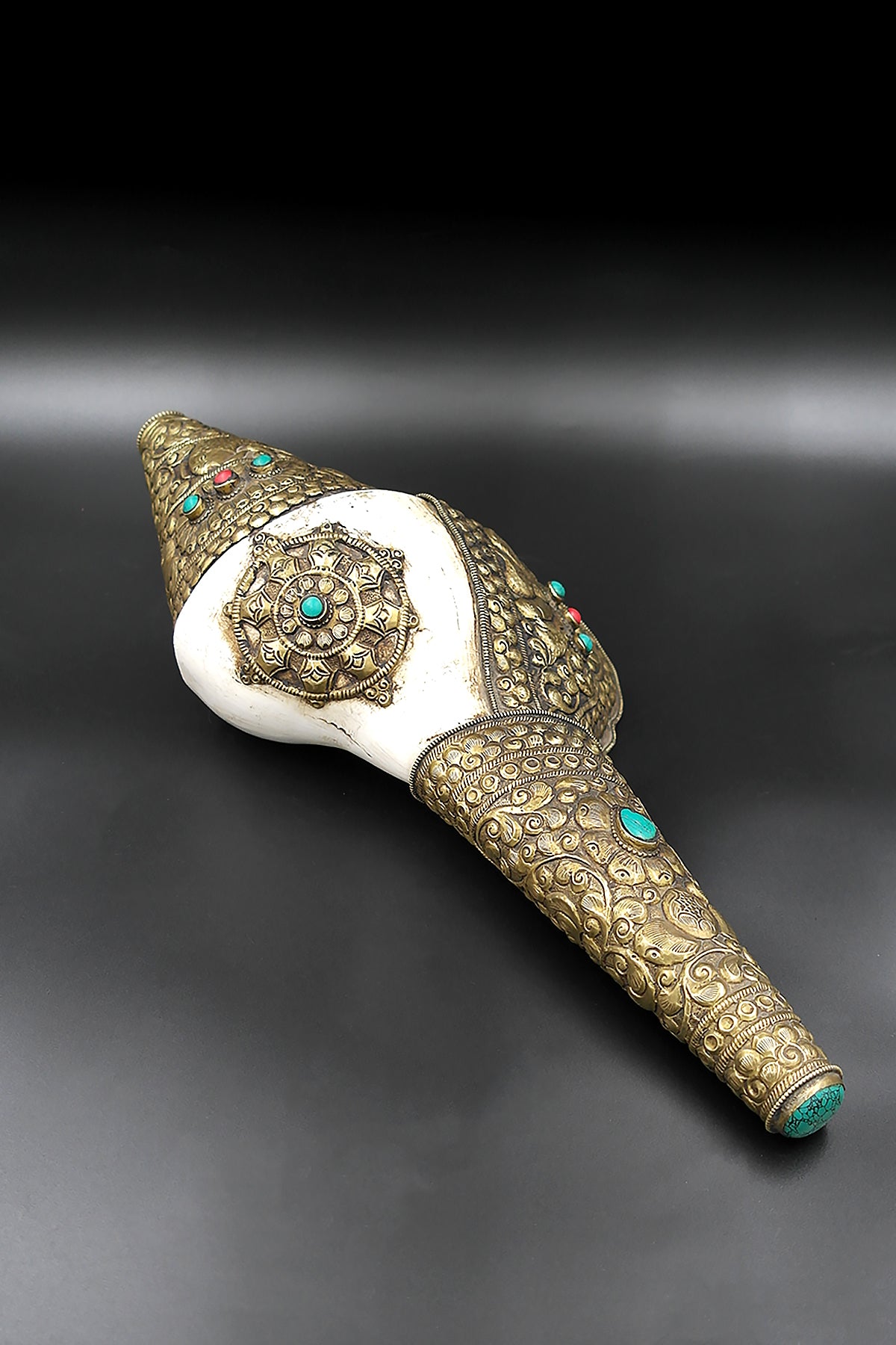Auspicious Symbol Dharma Chakra with brass metal Conch Sculptured Shell
