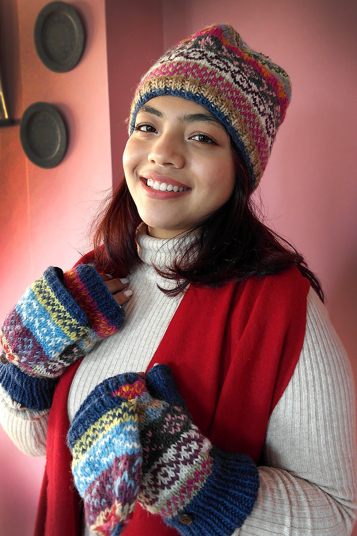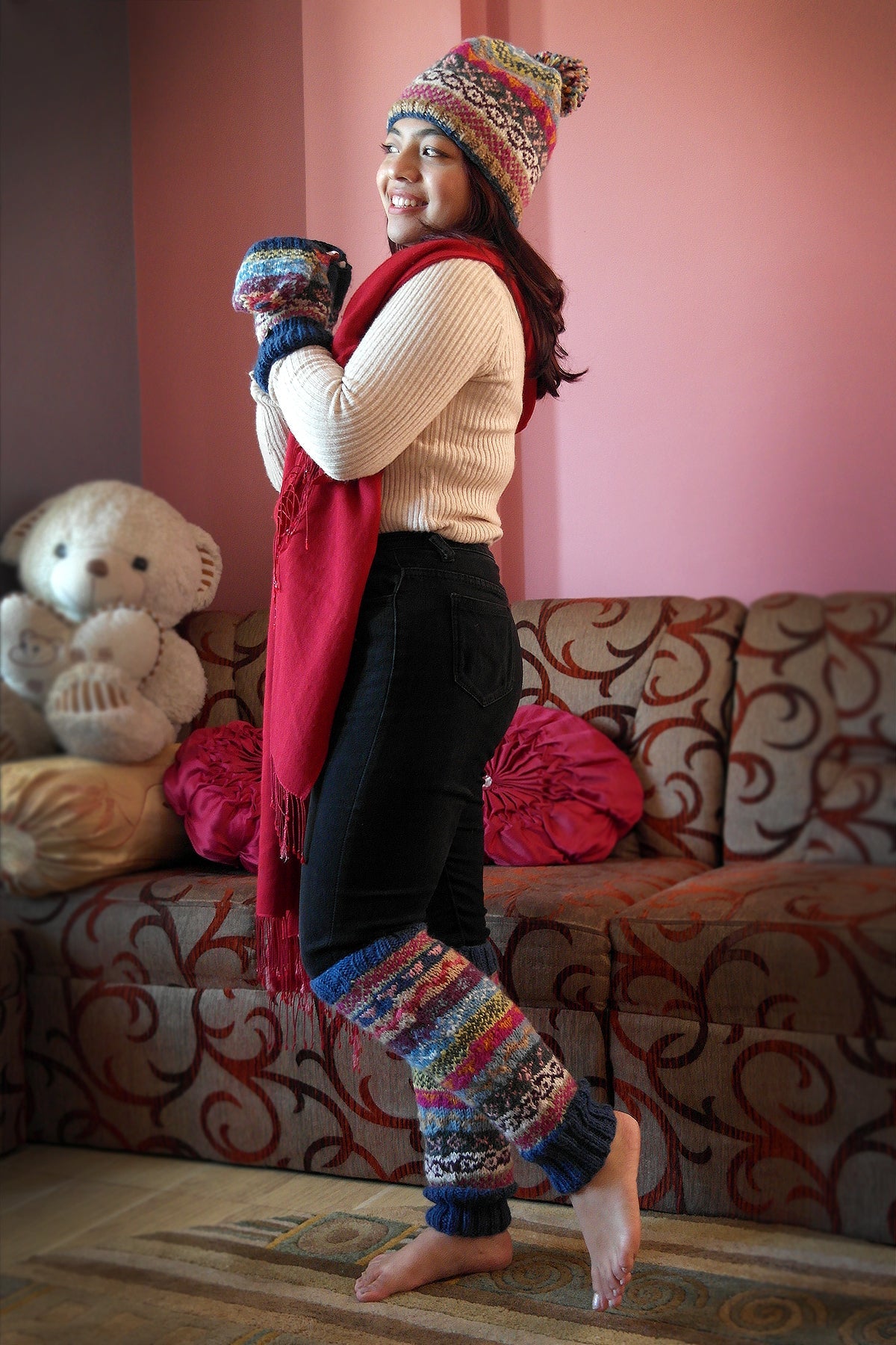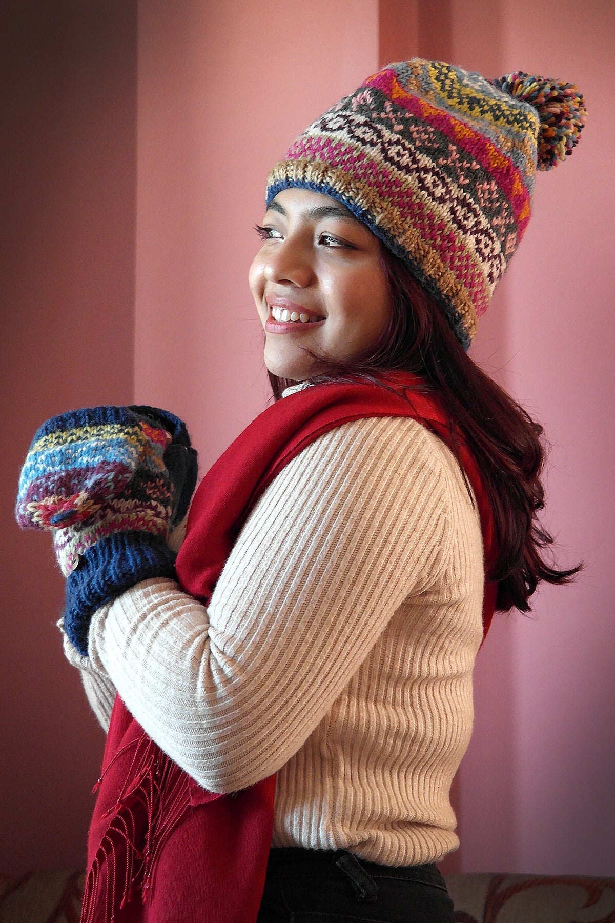 Hand Knitted Woolen Gloves For Women by our women artisan from Bhaktapur. The color combination of these gloves make them very pretty and fashionable. The fleece inside the gloves make it very soft and warm. These mittens are made by 100% wool, so very light weight.