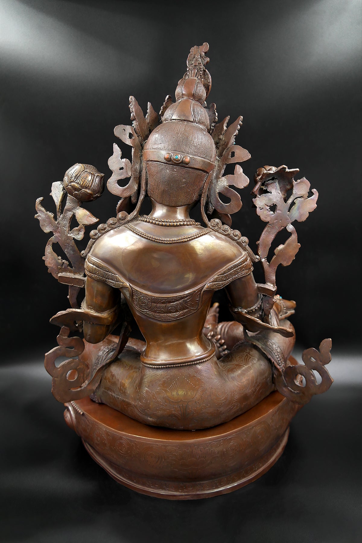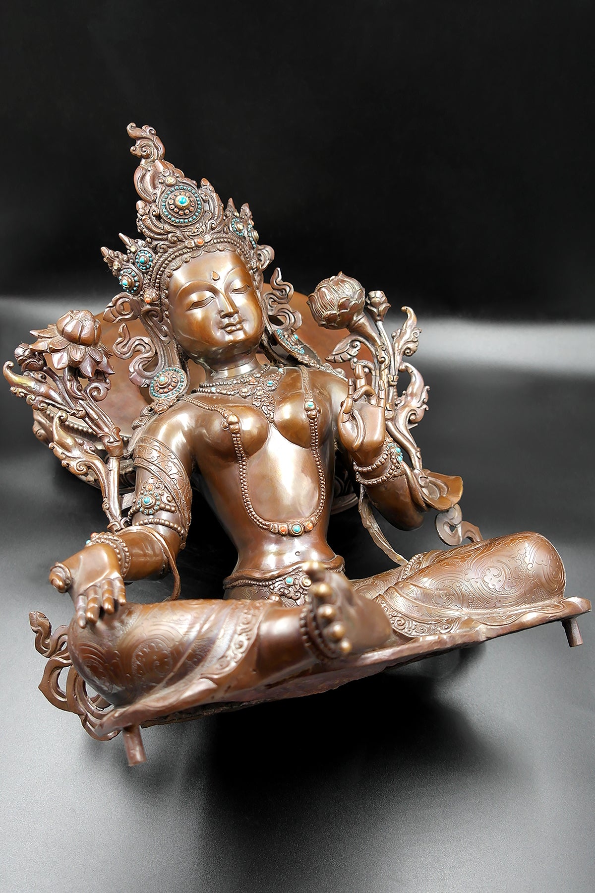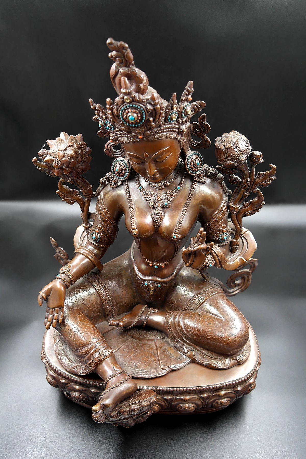 Fully Copper Oxidized Green Tara Statue in sitting position on lotus. This statue is jeweled with Coral and Turquoise stone. Green Tara, also known as Harit Tara in Nepal, mother of liberation is the most famous female deity in Buddhism. Green Tara is the female epitome of the illuminated empathy and phenomenal deeds of the multitude of Buddhas, offering security and help to all who face difficulties in their lives.