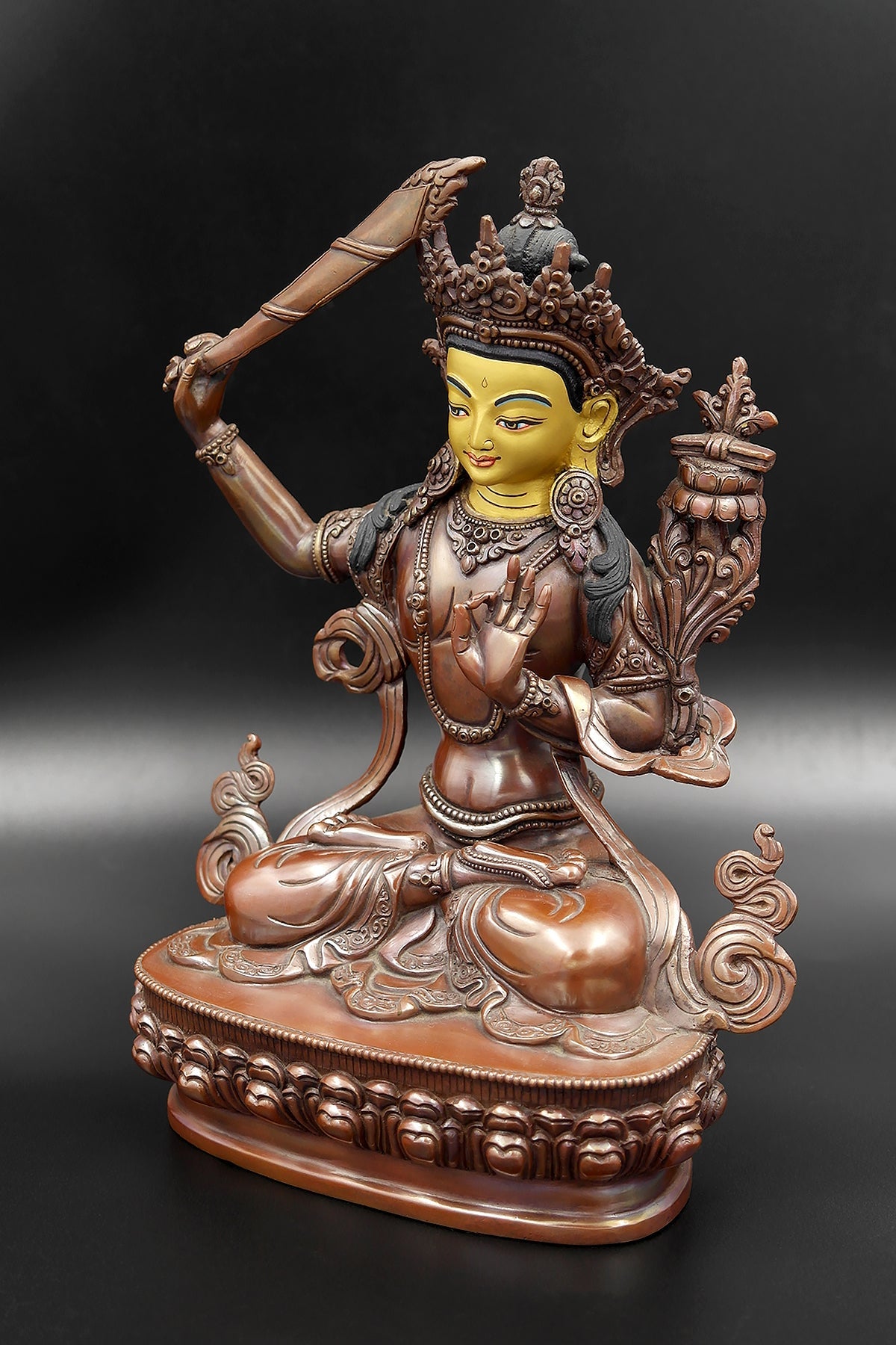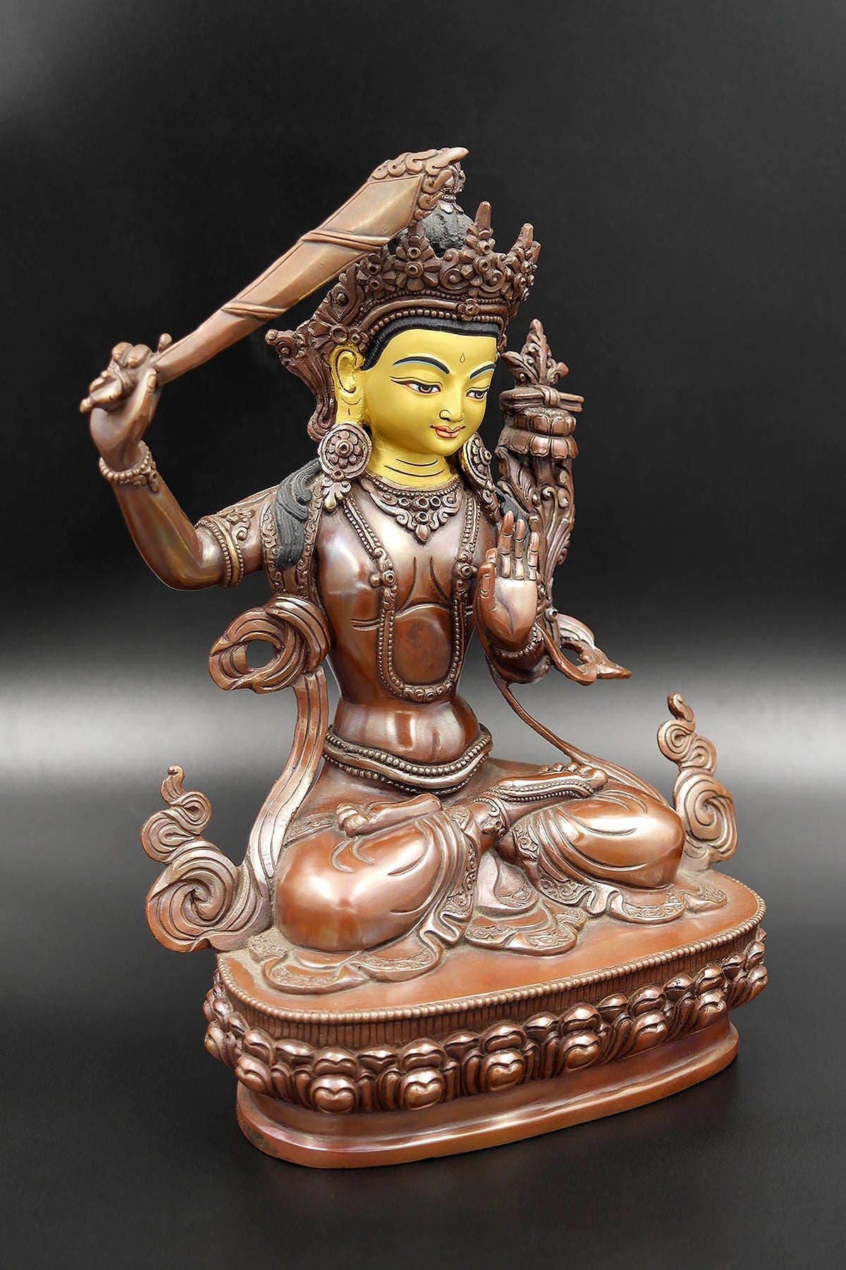 Antique looked Copper Oxidized Fine Quality Manjushree statue with gold painted face, Manjushree is also called Jampelyang or Sword of Wisdom which is made with oxidized copper alloy and Hand Painted on face with 24 carat gold. Manjushree embodies the all-knowing insight of edification - the insight that perceives the real essence of the real world. He can separate among right and wrong perspectives and among valuable and non-advantageous moves to be made on one's profound way. He gives insight, information, astuteness, dominance of the lessons, expressiveness and memory.