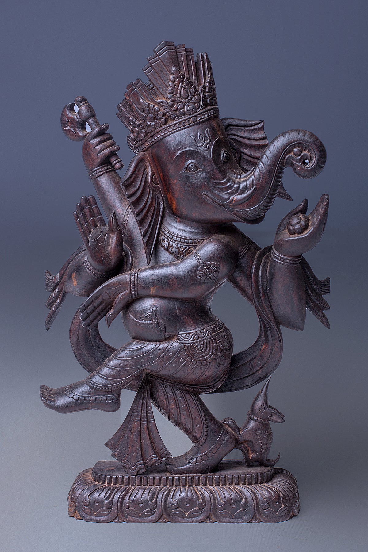 Ganesh is also known as "Vinayak" is one of the popular deities in Hinduism, representing the relaxed and enjoyable form. The Dancing Ganesha is believed to be dancing under the divine wish fulfilling tree (Kalpa Vrikshya). The dancing Ganesha idol has four hands one hand holding the battle axe, while other hand holding his famous snack Modak (dumpling) and rest two hands in the dancing position of Natraj, along with one foot placed on the ground and the other raised on the air for the during the dance.