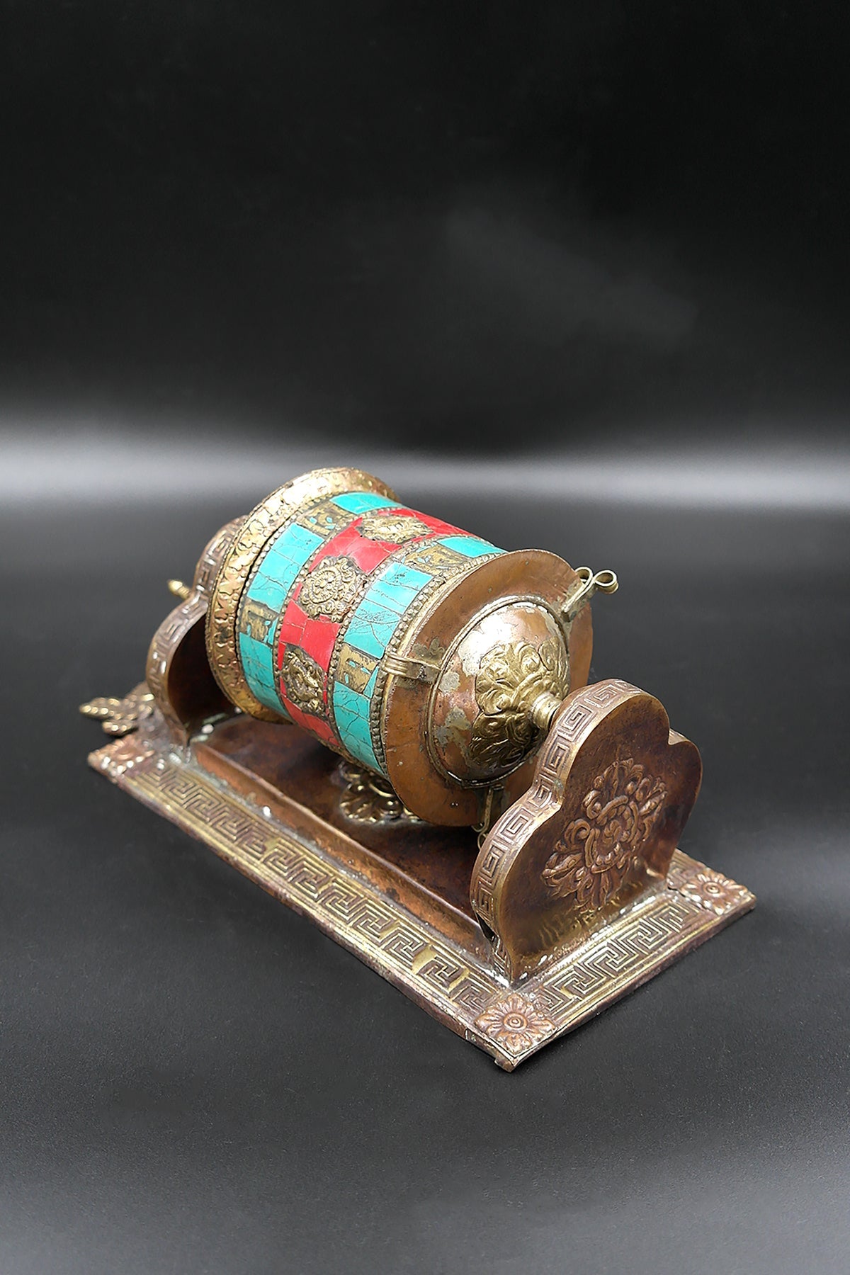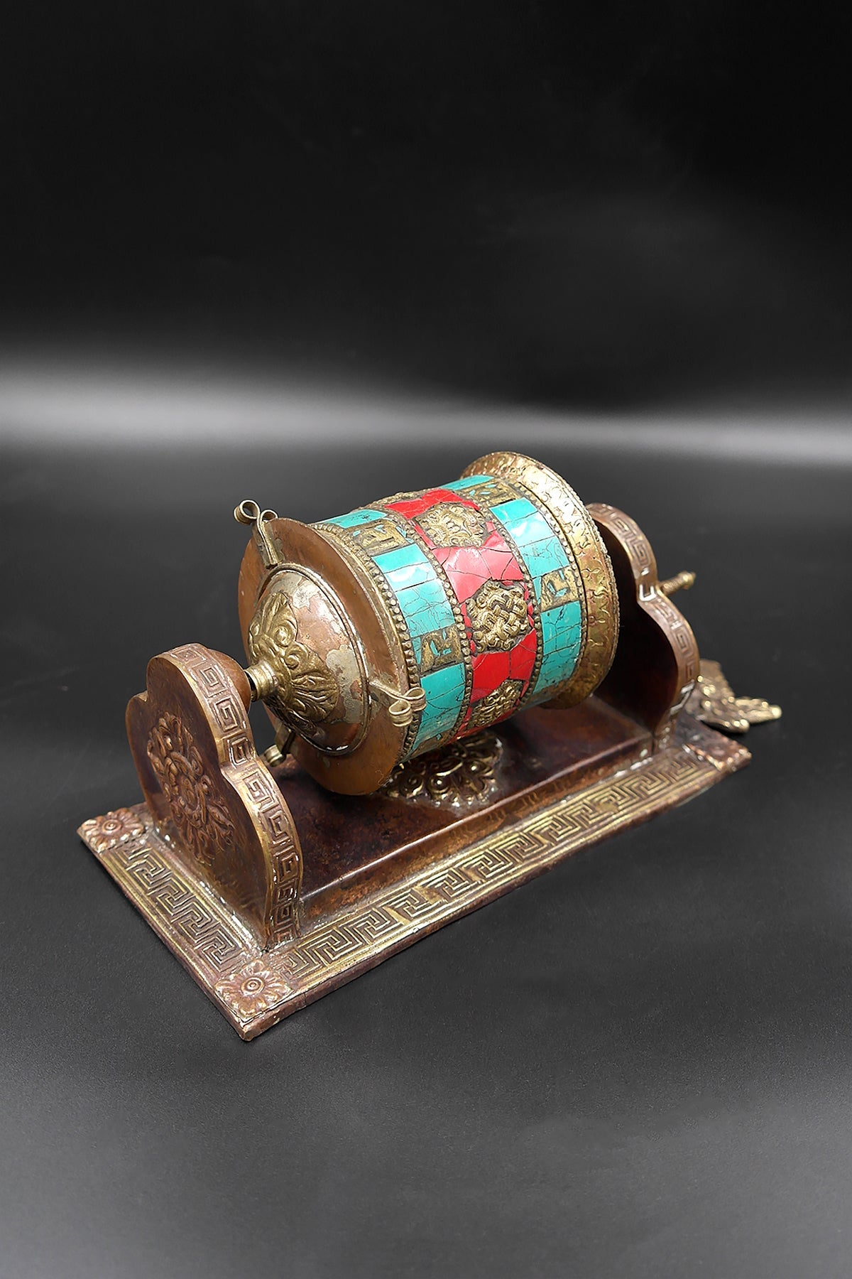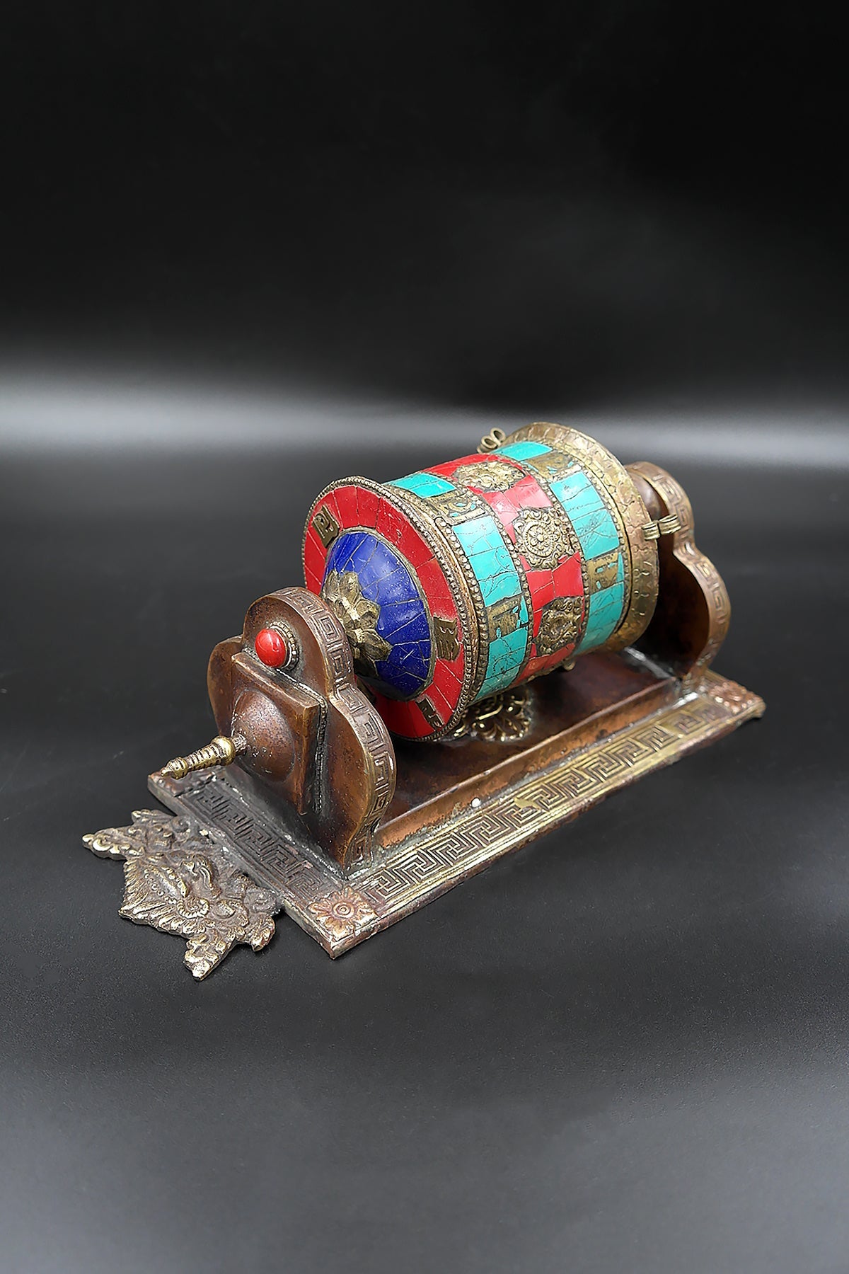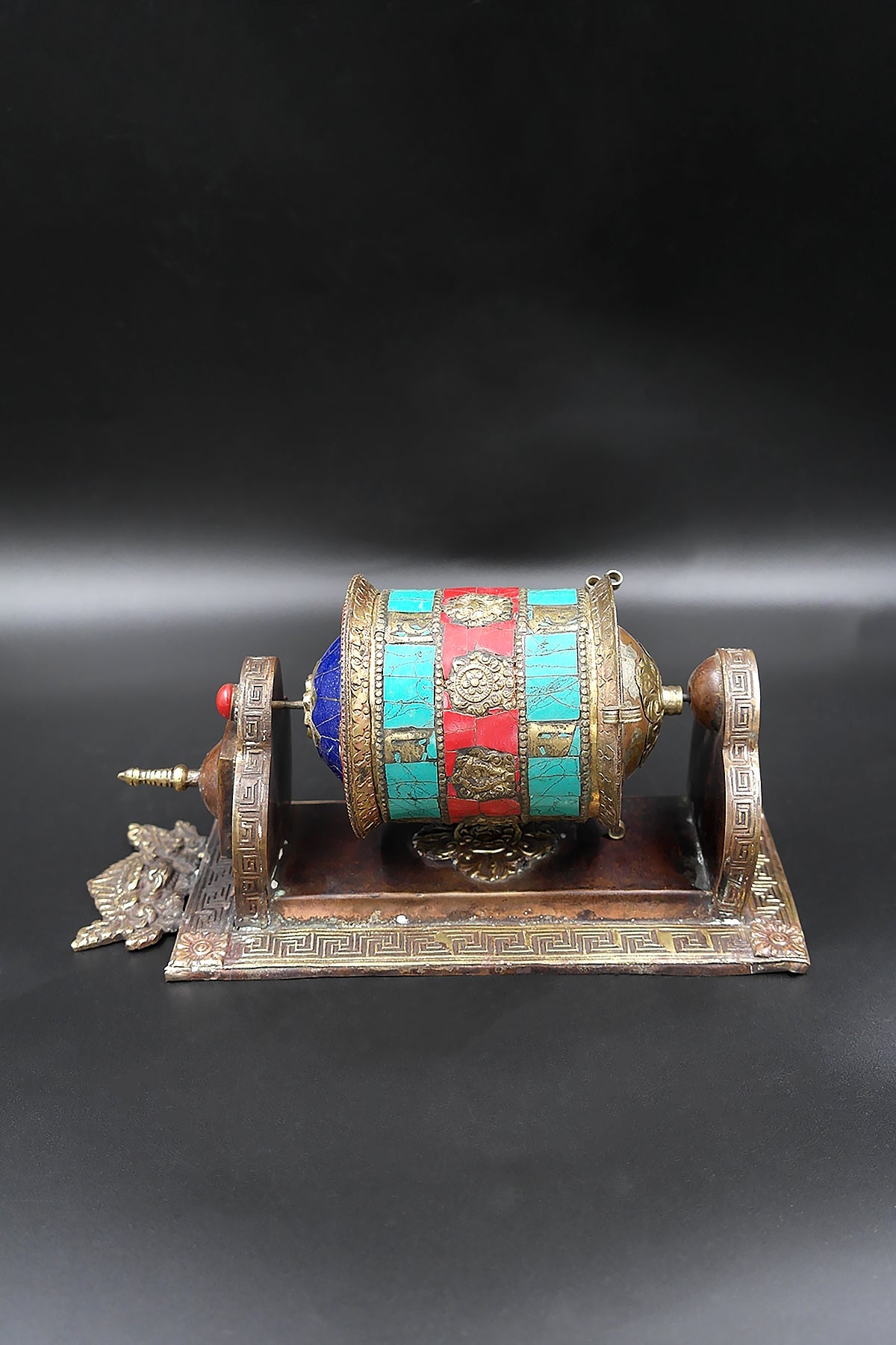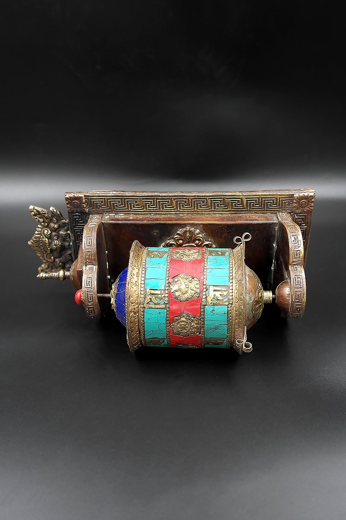 It's even more beautiful because it's studded with sparkling gems. Gemstones like turquoise, lapis and coral add a mystical charm to prayer wheels. This prayer wheel is designed to be wall-mounted, making it great for space utilization and making it a great interior accent wherever you hang it. Inside the wheel is a scroll with a sacred mantra written on it, so each time you turn the wheel, it has the same effect as reading the mantra.