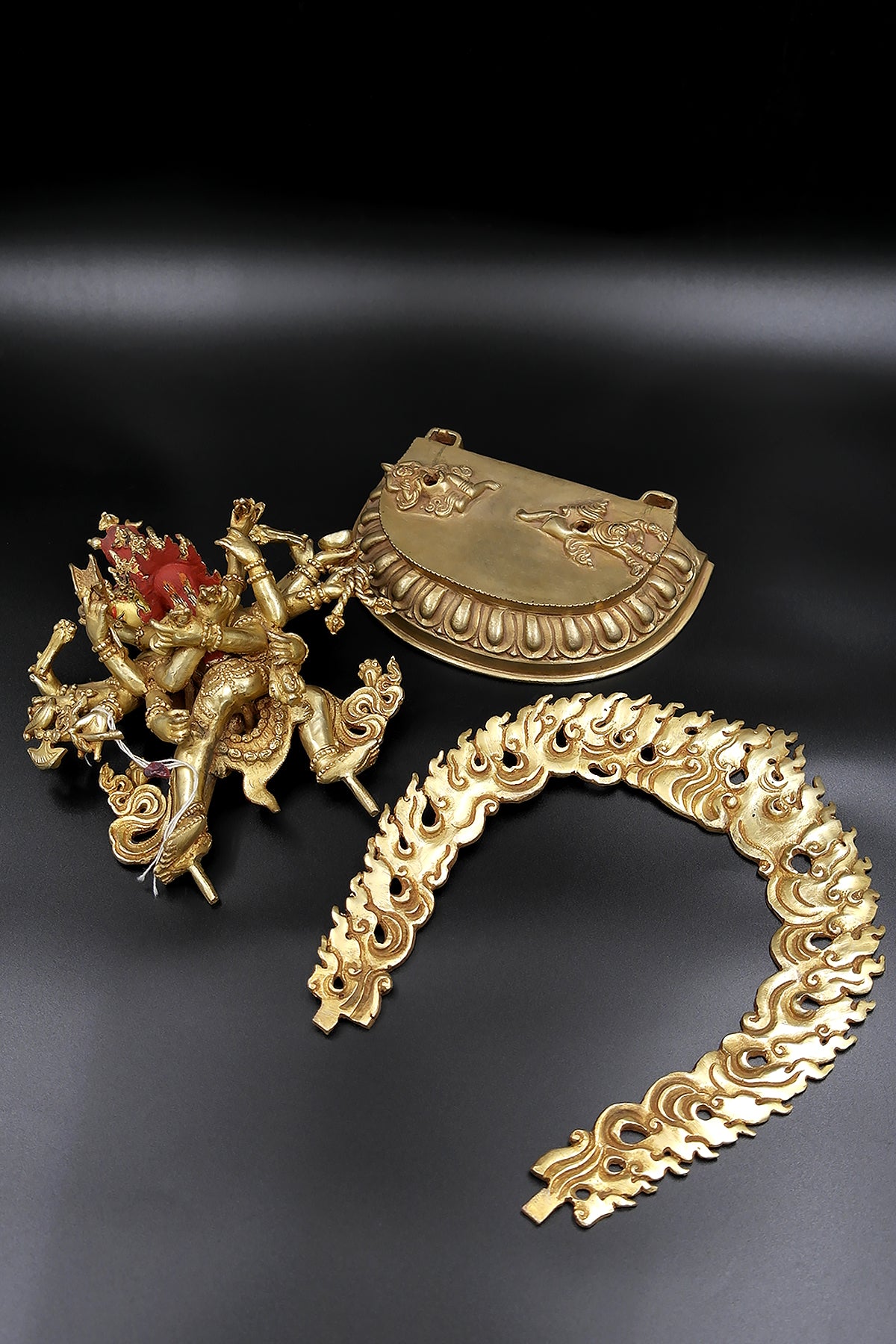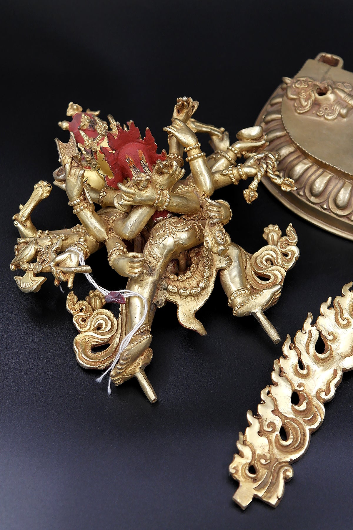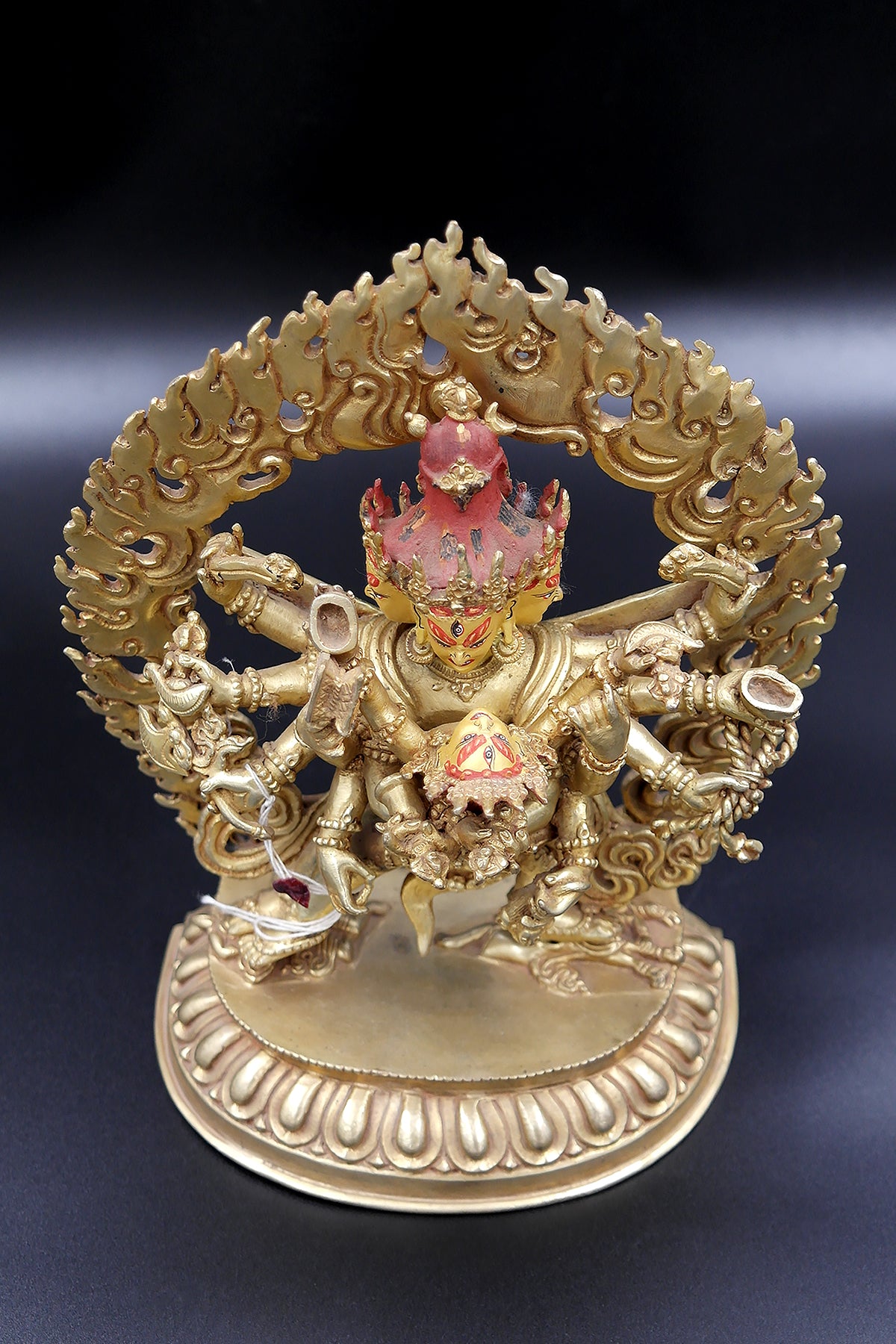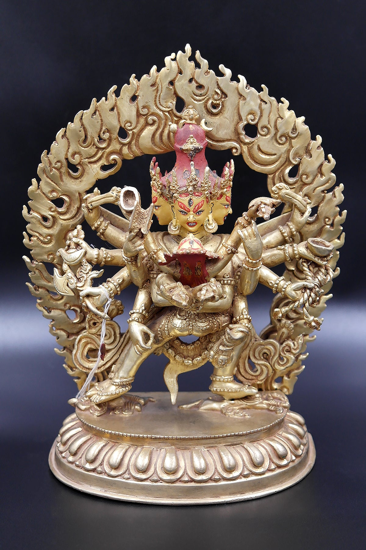 Chakrasamvara is one of the most popular deities in Tantric Buddhism in Nepal. A Chakrasamvara embracing his consort Vajravarah in yab yum, symbolizing the union of Wisdom and Compassion in tantric Buddhist belief. Chakrasamvara's stands in the dynamic posture of alidhasana on the crushed figures of the Hindu deities Kalaratri and Bhairava, symbolising the defeat of the enemies of Buddhist doctrine . His twelve arms hold various ritual implements including a ghanta, damaru, kartrika, pasha and khatvanga, while stretching an elephant skin behind him. Vajravarahi, with her legs wrapped around his waist, holds a kapala in her left hand and a kartrika in her right. A flaming aureola surrounds the head of Chakrasamvara. Chakrasamvara and Vajravarhi wear the tantric adornments of the six bone ornaments representing the six paramitas or perfections and also represent the Five Dhyani Buddhas. The meticulously depicted ornaments include: the crown, symbolizing dhyana or concentration and the Buddha Akshobhya; the earrings symbolizing patience and the Buddha Amitabha; the necklace symbolizes generoisity and the Buddha Ratnasambhava; the armlets and anklets symbolizing discipline and the Buddha Vairocana; the girdle and apron symbolizing exertion and the Buddha Amoghasiddhi; the crisscrossed torso ornament that symbolizes wisdom and the Buddha Vajradhara. Chakrasamvara also wears a garland of severed heads.