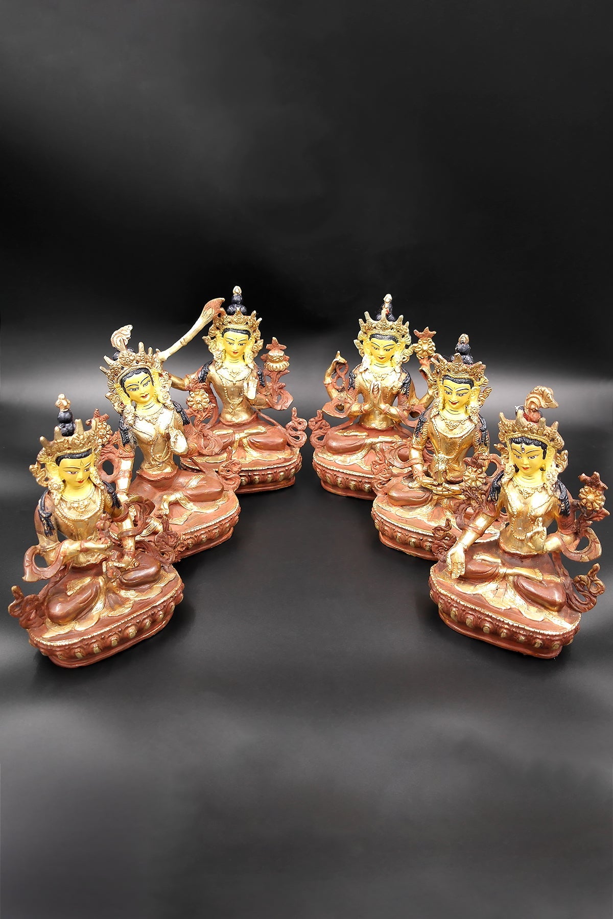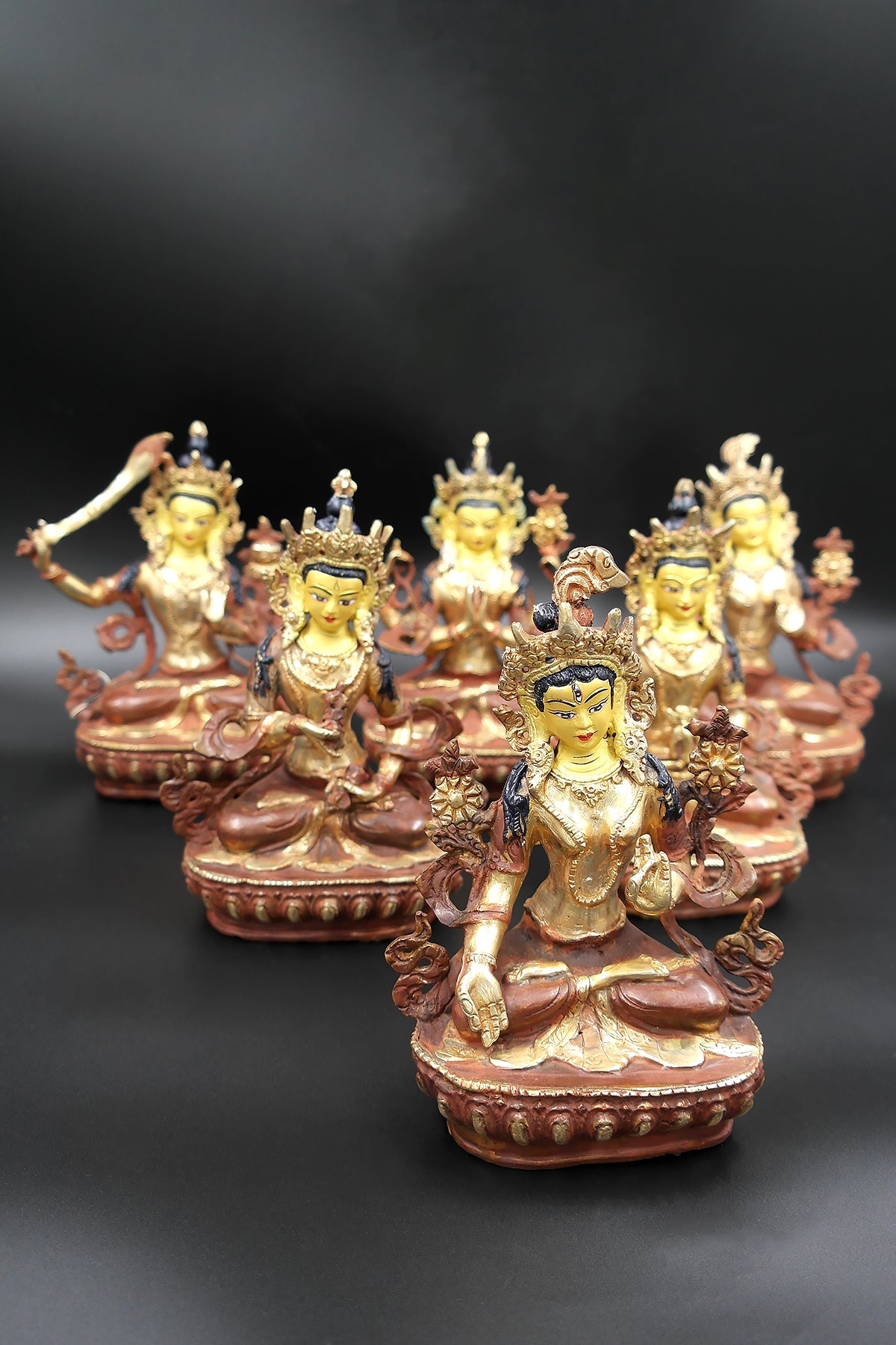 Introducing the stunning 6 Tara Tibetan Buddhist Deities set, a beautifully crafted piece that will add a touch of spirituality and beauty to your home or meditation space. This set includes the Green Tara, Manjushri, Chenrezig, Vajrasattva, Amitabha and White Tara.