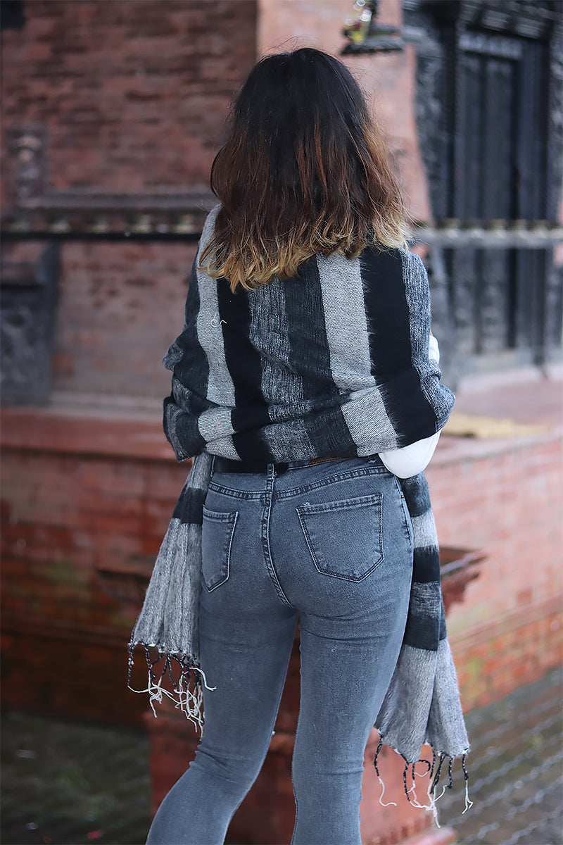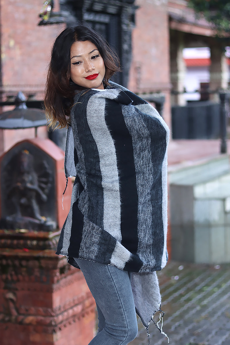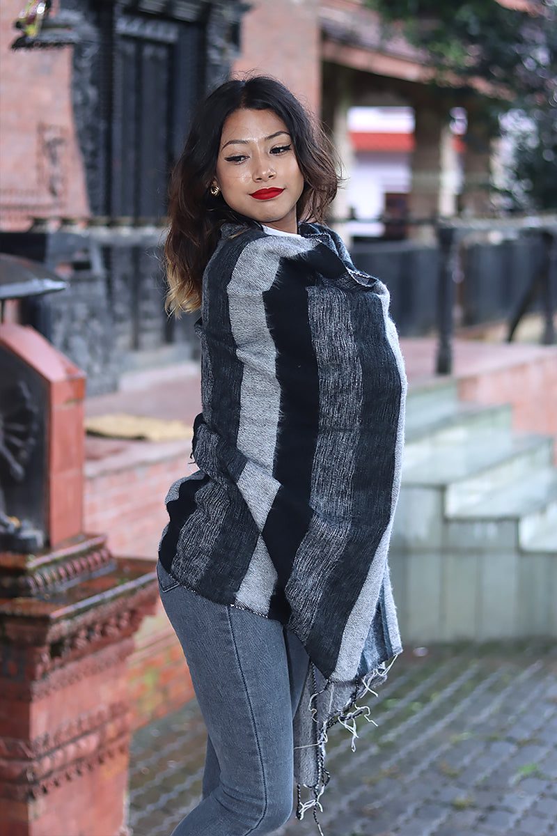 This Yak wool Wrap is in natural colors of stripe with grey and black colors. It can be used in a cool Spring, breezy night/day. It is extremely warm and great for indoor/outdoor events. It can be used as a wrap.