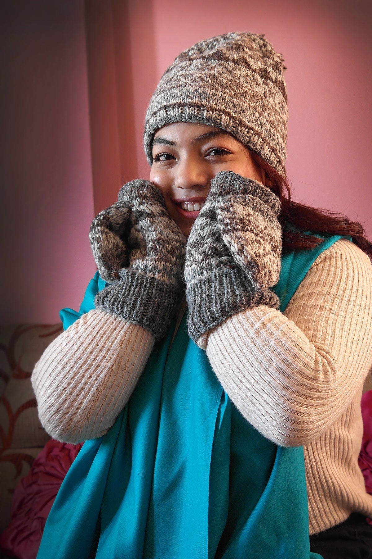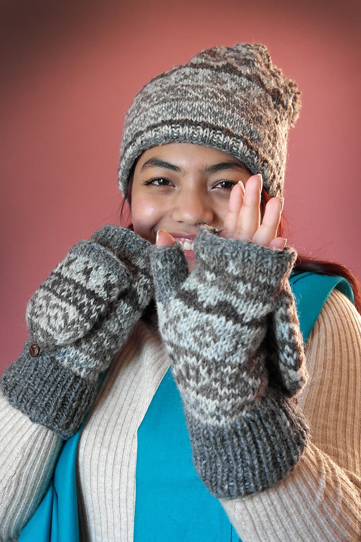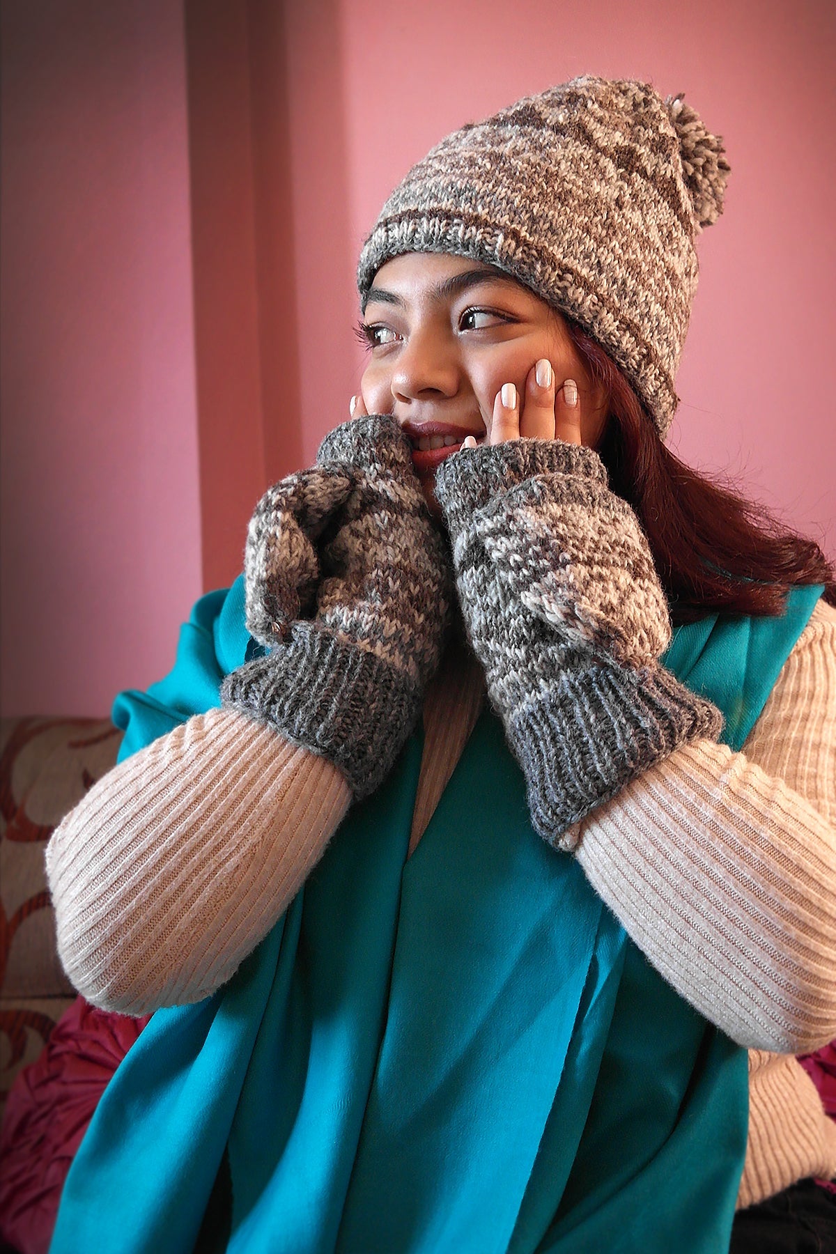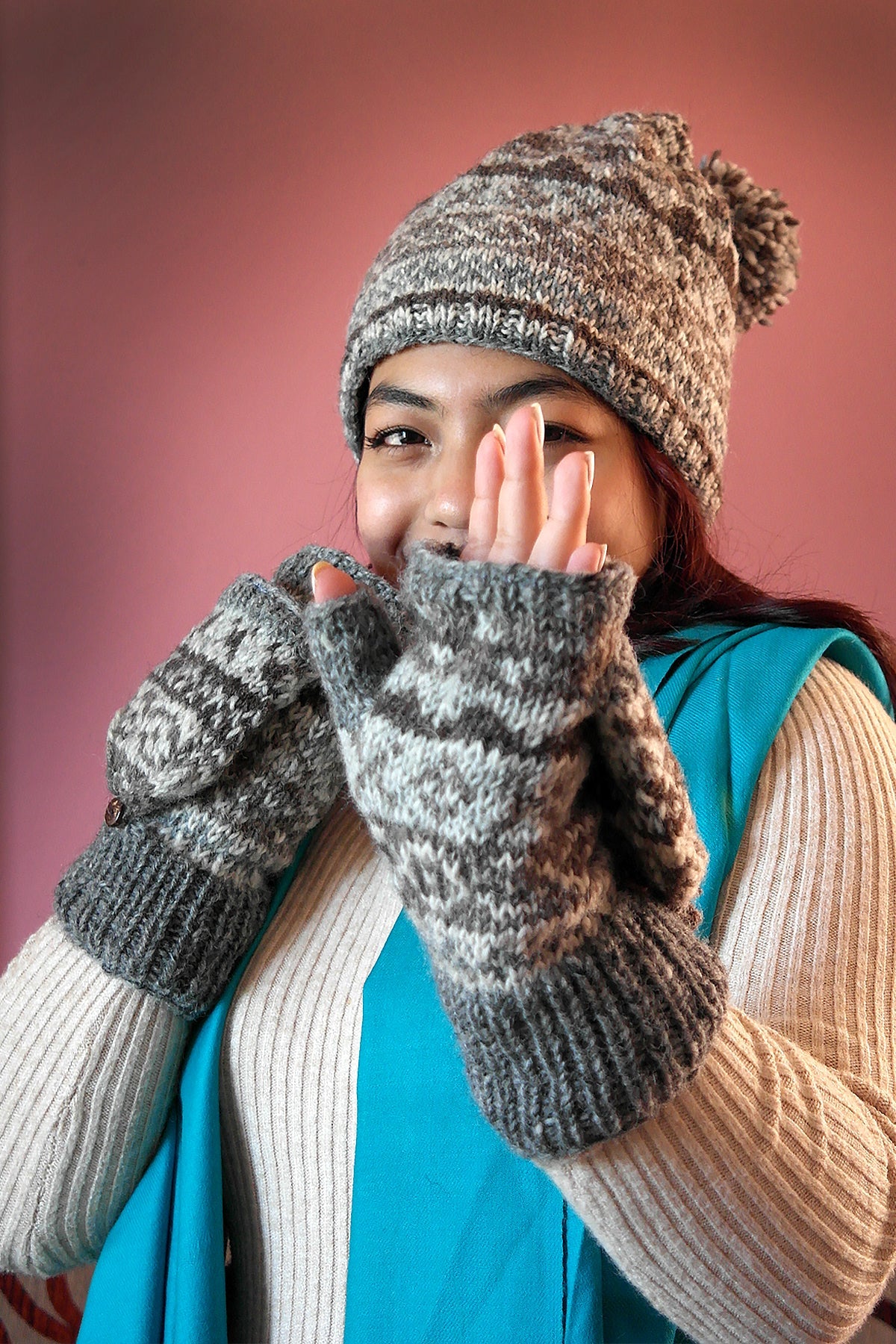 The natural colors mixed hand knitted woolen Gloves or mittens are made from 100% wool by our women artisan from Bhaktapur. There are soft fleece inside the gloves, which keeps your hands extremely warm. There are open hole for thumb and for four fingers and finger cap for four fingers.