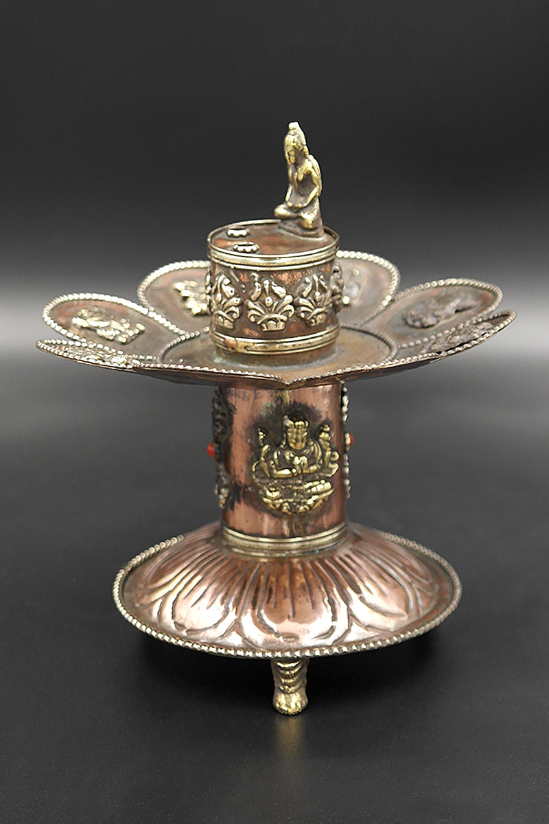 The incense burner is given the shape of beautiful lotus flower. The petals of the flower is finely carved with Tibetan eight auspicious symbol. In middle handle, there are bajra shapes. The incense burner is supported by three legs to stand on.