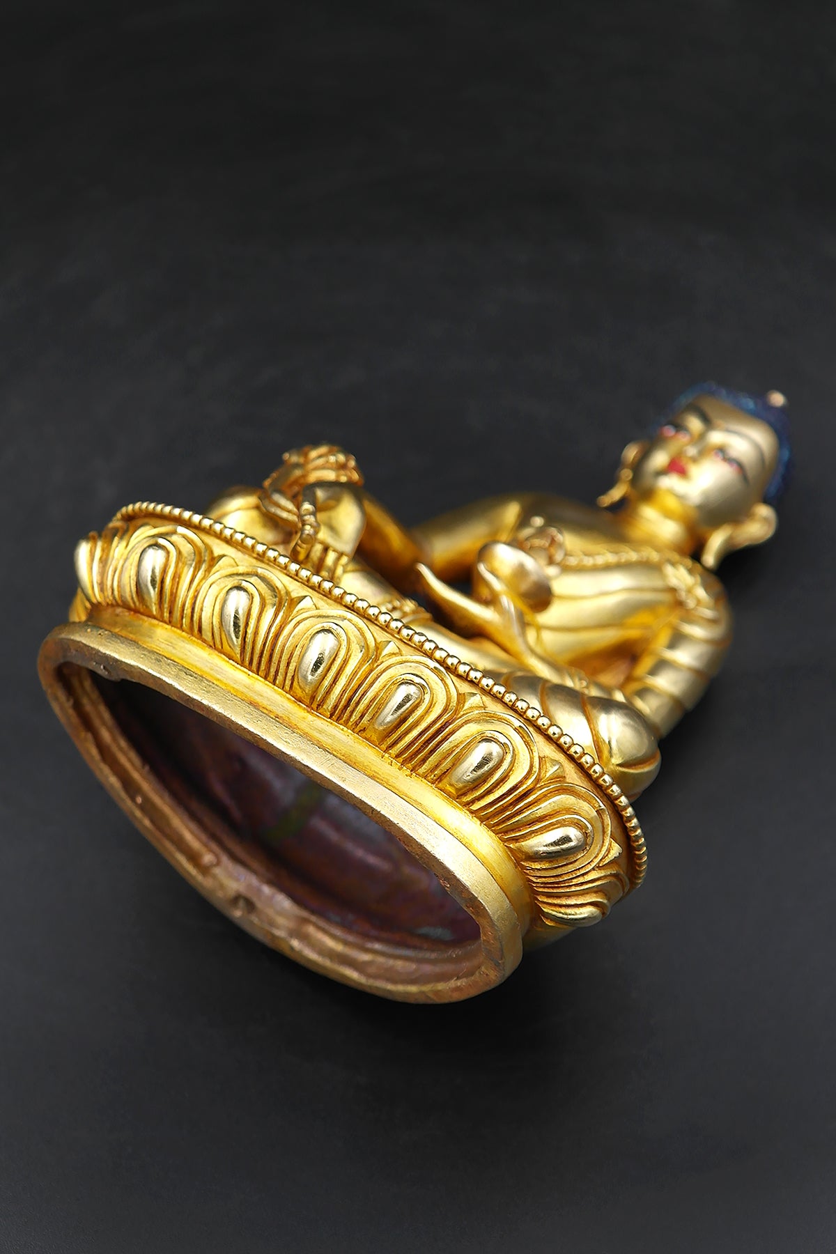 In Buddhism Blue signifies the concept of loving kindness and peace where as Yellow signifies the Middle Path, that is, the complete absence of form and emptiness and Red color symbolizes achievement, wisdom, virtue, fortune, and dignity. The carving made this healing buddha statue as masterpiece among many Medicine Buddha Statues. The fine carving on front and back.
