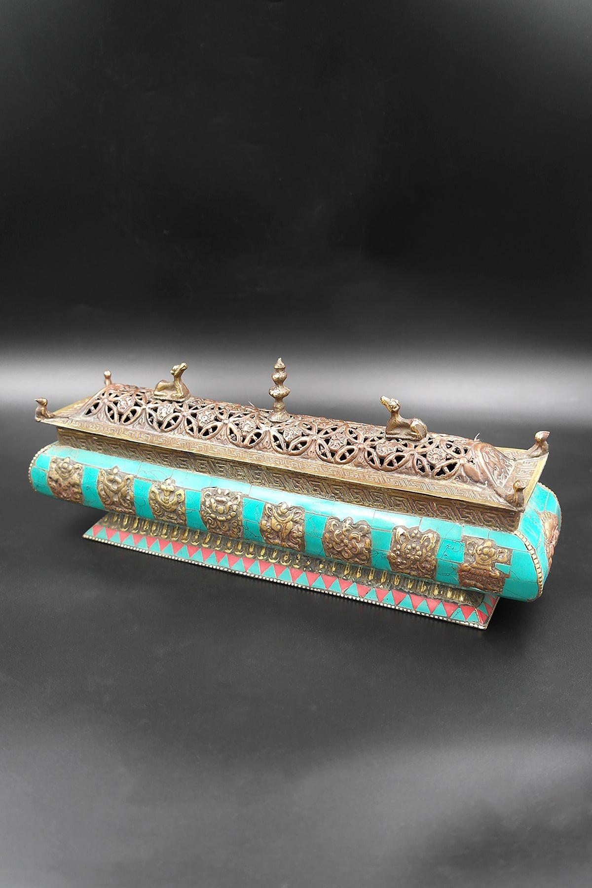 This incense burner, it's made of shiny copper, so it's very sturdy and cool. Plus, it has amazing brass patterns all over it, and it's got real turquoise and coral in it, so the colors are a work of art. It's like a treasure chest.