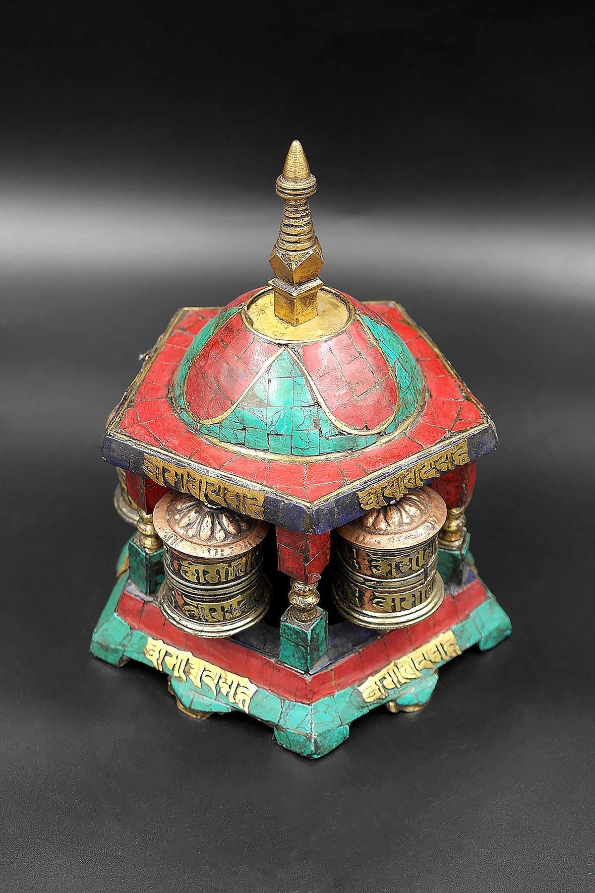 The stupa on top and there are four prayer wheels with two lines of Tibetan mantra. Perfect for tabletop display, this prayer wheel can also be used as a decorative piece in your home or office, serving as a constant reminder of peace and mindfulness.