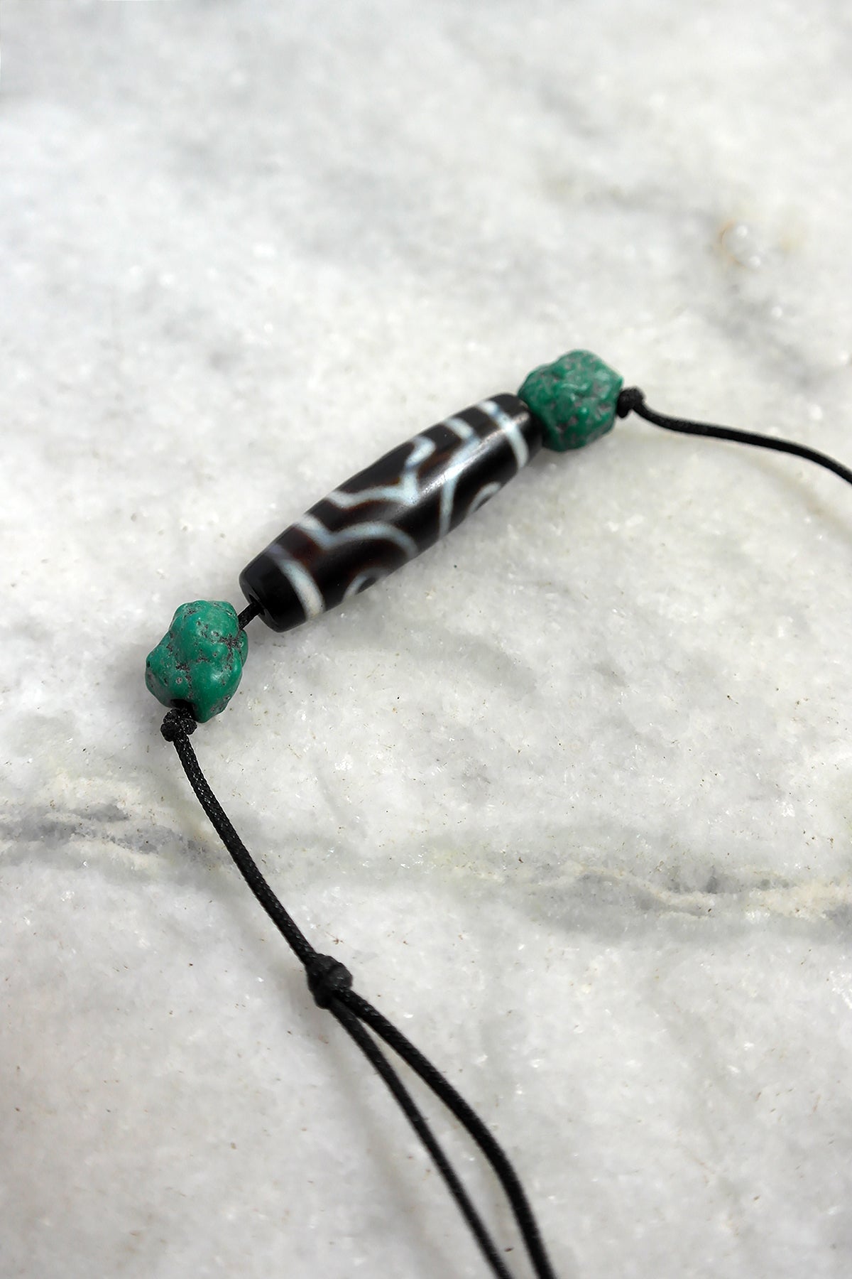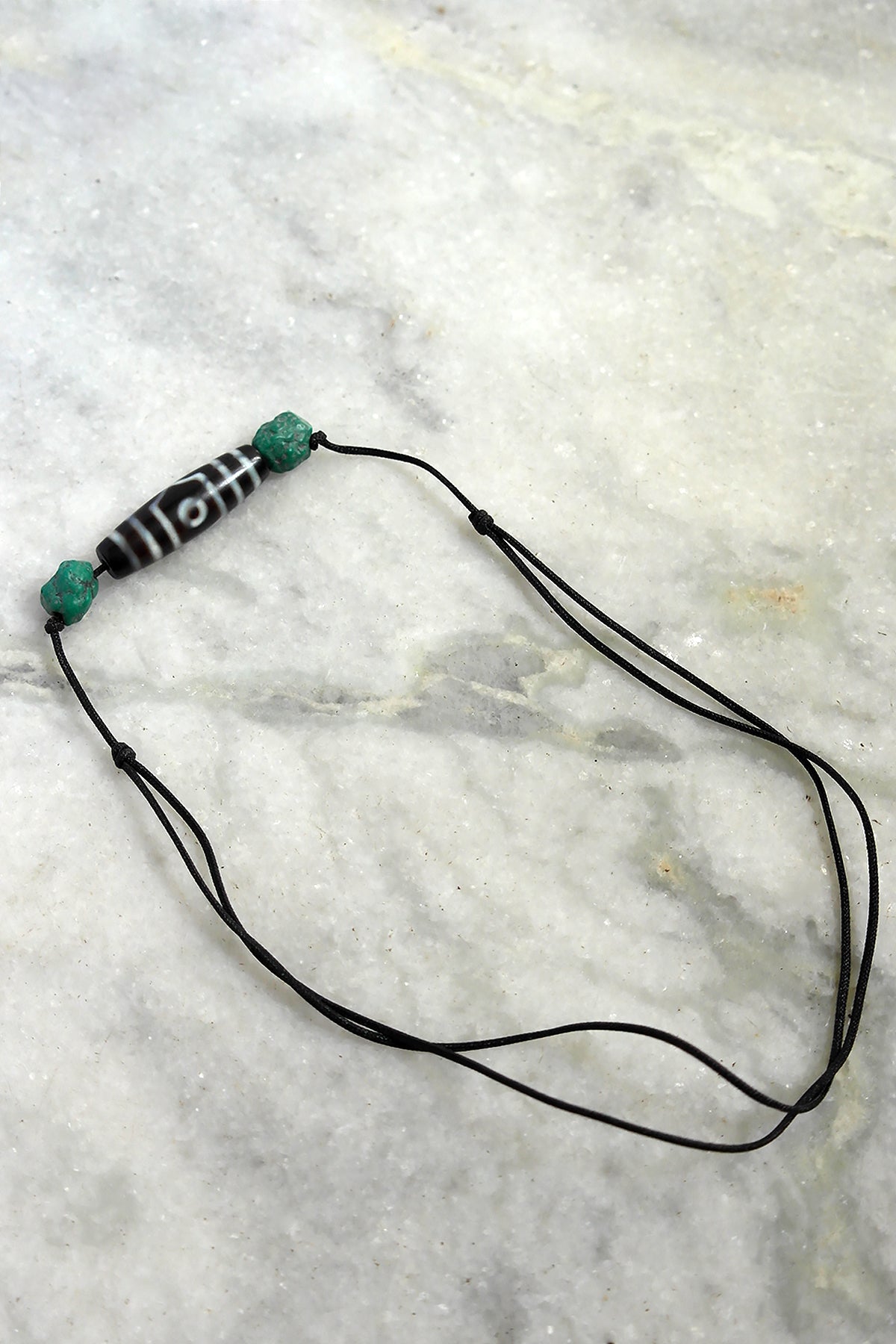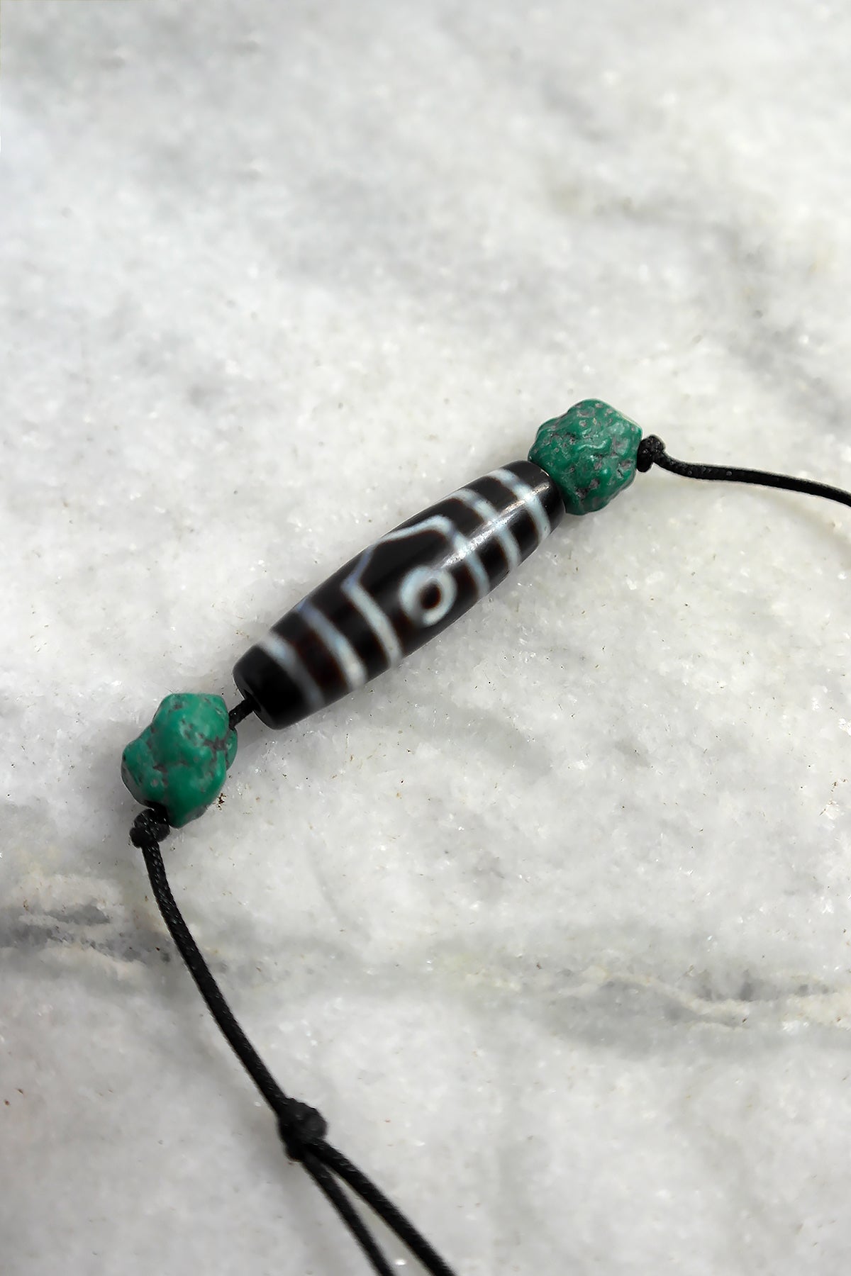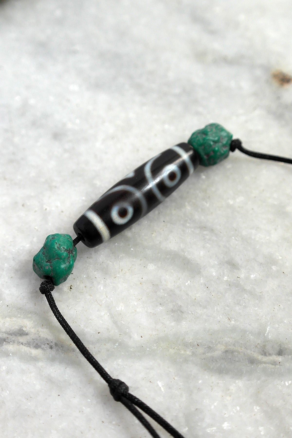 Discover the mystical allure of our Three Eyed Tibetan Dzi Beads along side two Turquoise beads, expertly crafted to enhance your spiritual journey and elevate your style. Each bead features five distinct eyes, symbolizing protection, wisdom, and good fortune, making them a powerful talisman for personal growth and enlightenment.