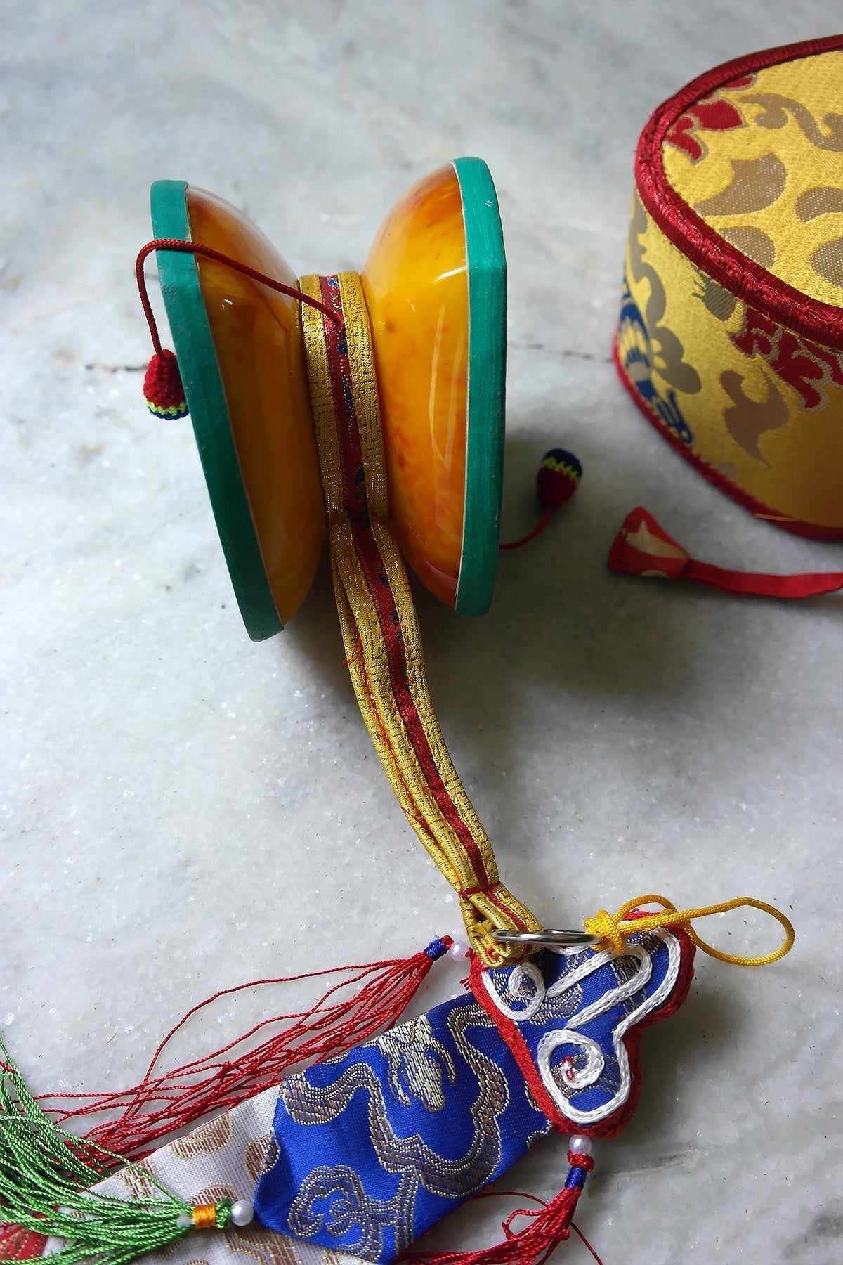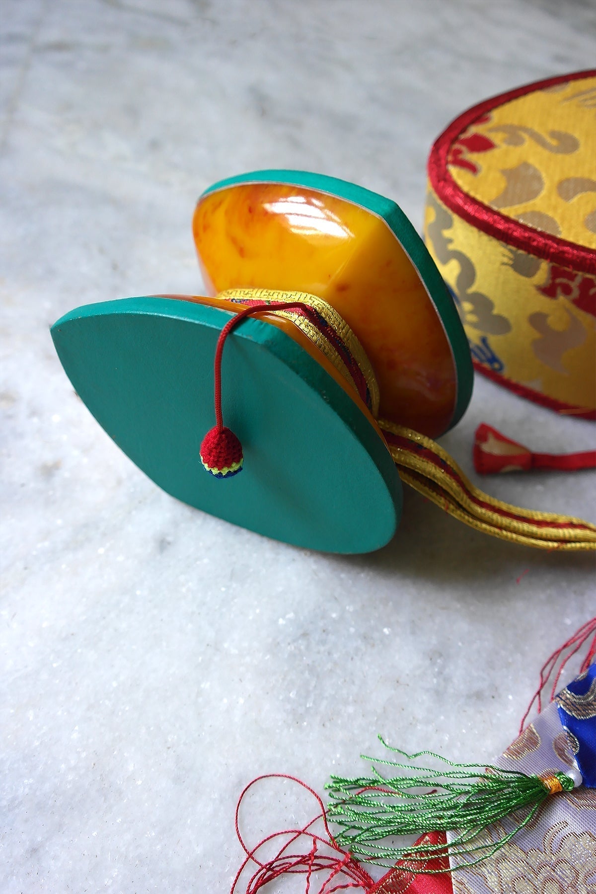 The Handmade Chod Drum made from the Resin. Experience the power of traditional Buddhist practice with our Handmade Buddhist Hand Painted Chod Drum, Damaru from Boudhanath. Resin Damarus are less susceptible to environmental changes compared to wooden drums, making them ideal for various climates. The sound produced by resin Damarus can be distinct, often resonating well during rituals. Even resin looks same as wood, which features intricate hand-painted designs that are steeped in symbolism and tradition.