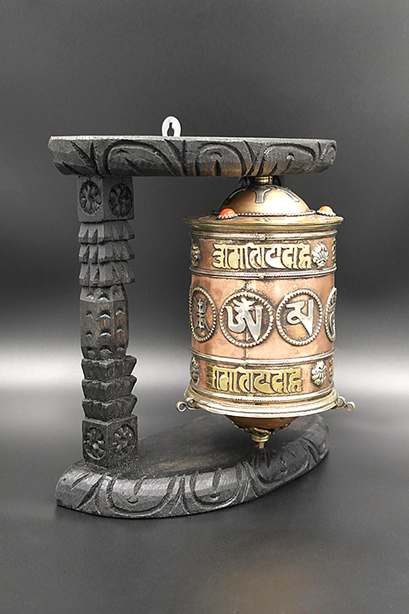 The prayer wheel is handcrafted by Nepalese Artisan in Patan. It comes with wooden frame and metal hook on top, so it can be placed on wall, however wooden frame can also be displayed on tabletops