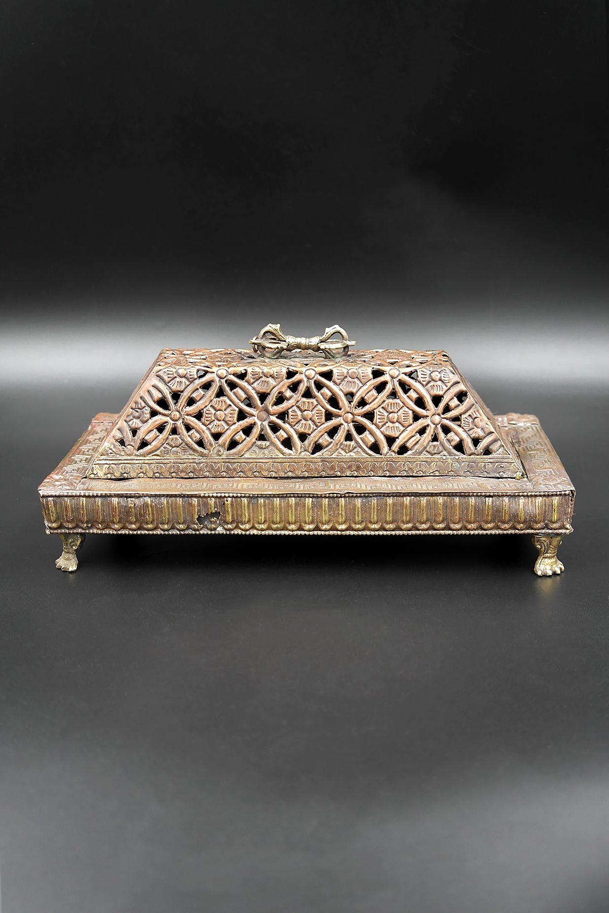 This traditional design will never tire of you and will be a timeless piece you'll love for years to come. It stands out as a work of art. Whether you're meditating, practicing yoga, or simply want to relax with a nice scent, this copper incense burner will provide the perfect healing moment. There is a Vajra at top of the incnense burner.