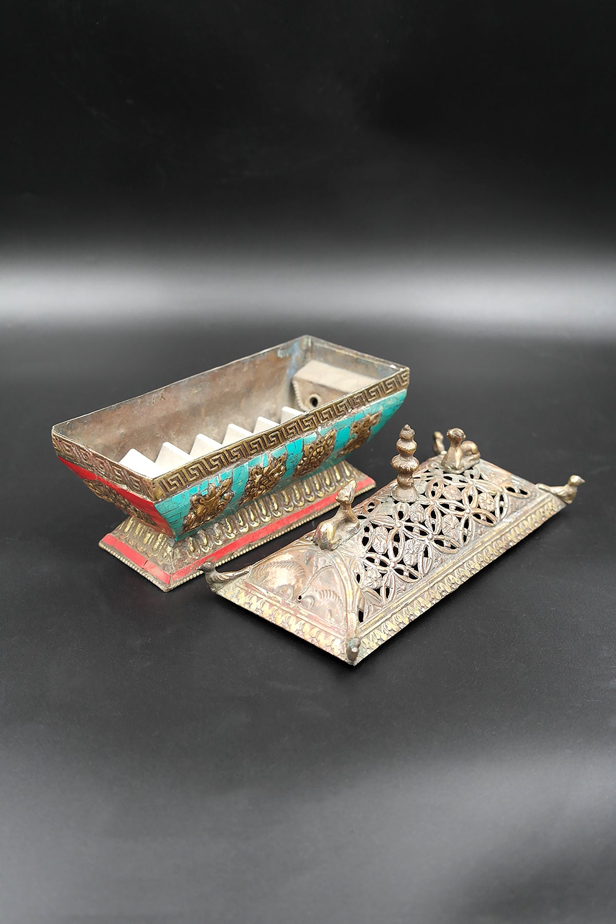 A magical item has appeared that will transform your space into a peaceful and mysterious space. It is the turquoise inlaid deer & lucky 8-sign incense burner. This is not just an incense burner, it is a work of art that will calm your mind the moment you look at it. The turquoise inlay on the body part of the incense burner sparkles. The beautiful and artistic holes on the upper part of the burner makes the incense burner look even more special.