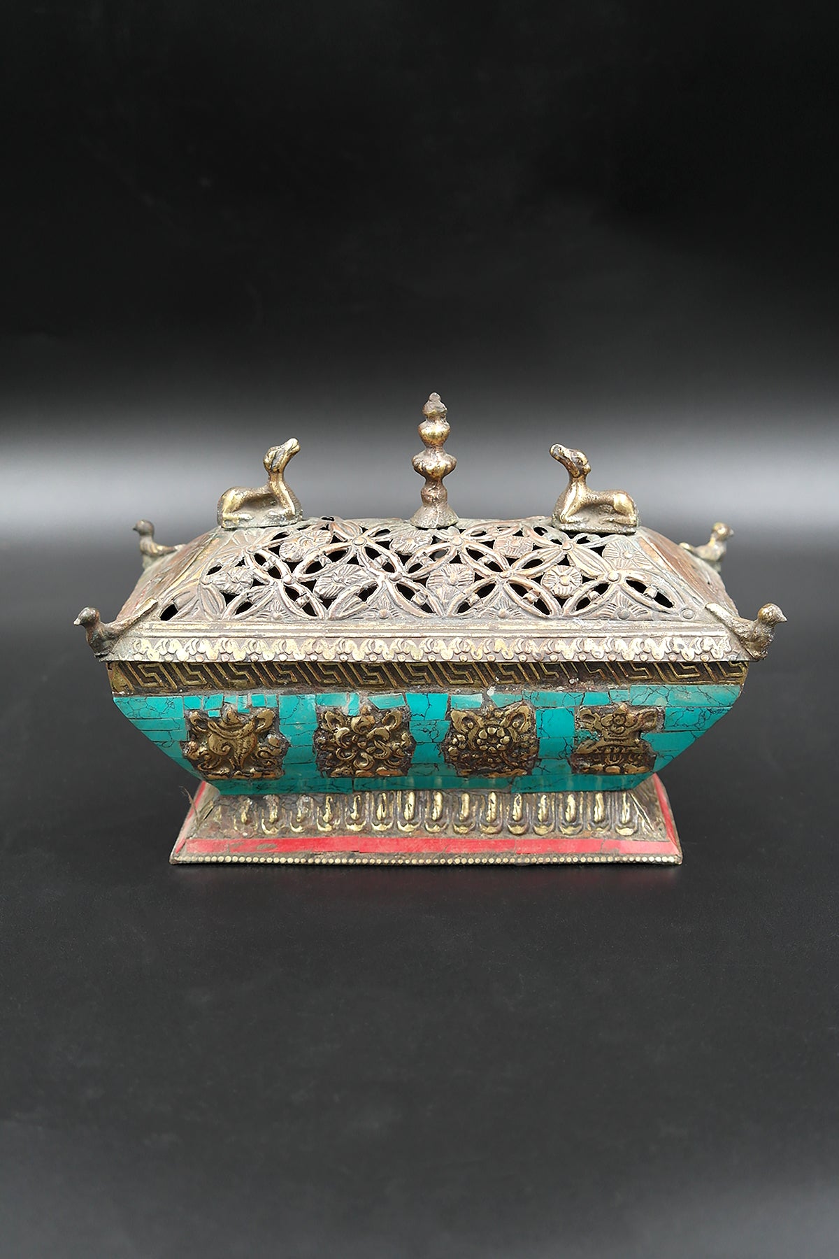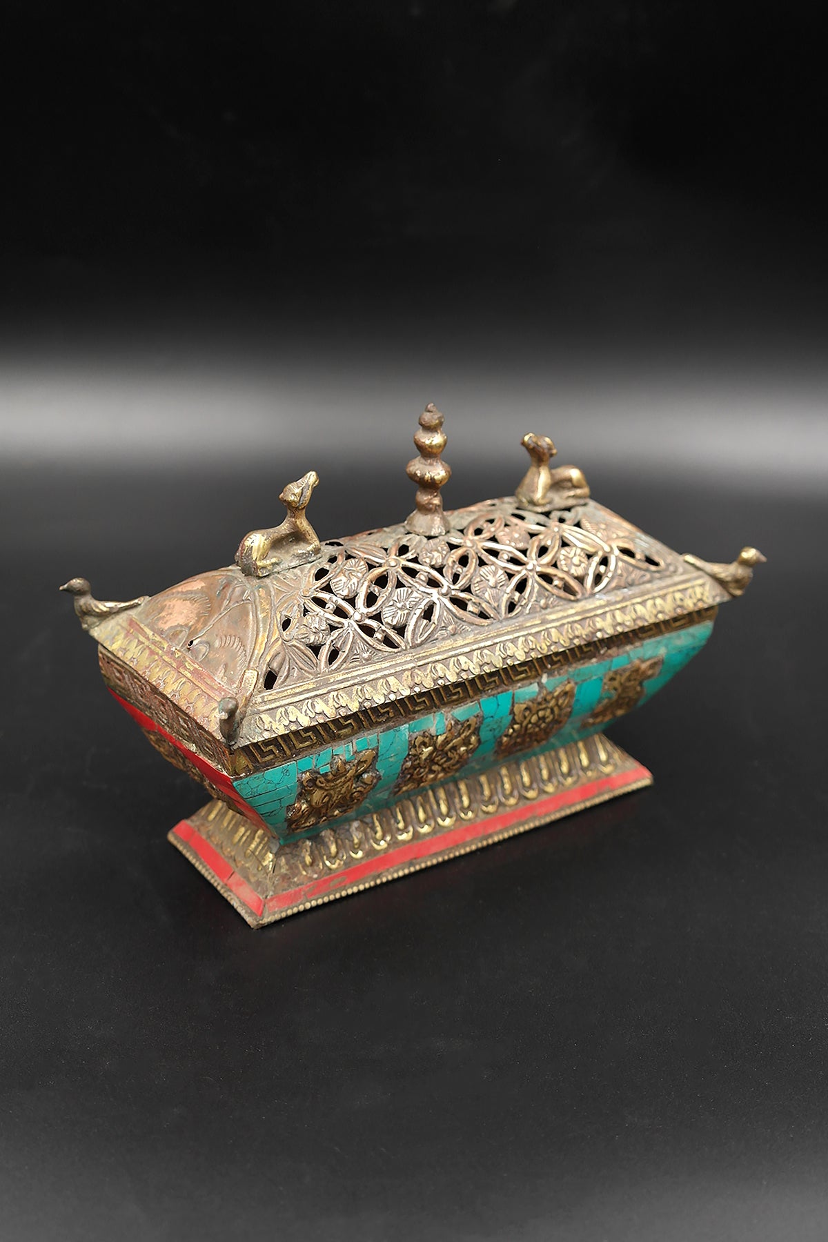Turquoise Inlaid Tibetan Deer & Lucky 8-Signs Incense Burner